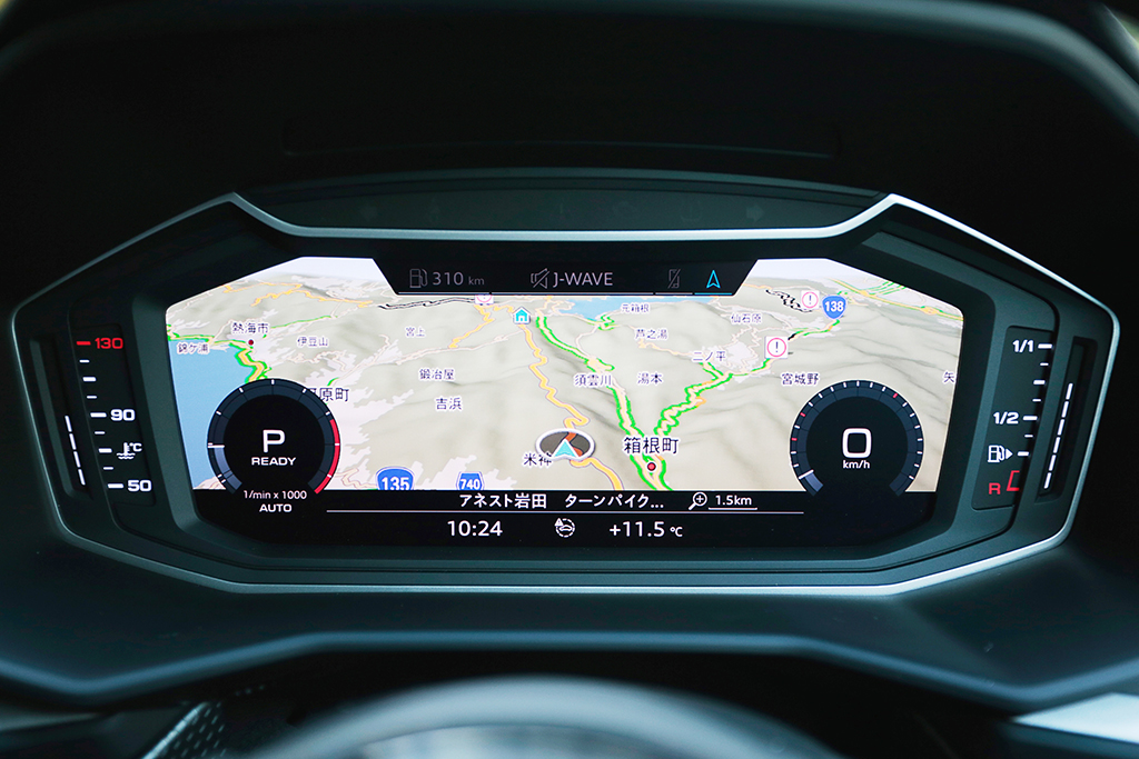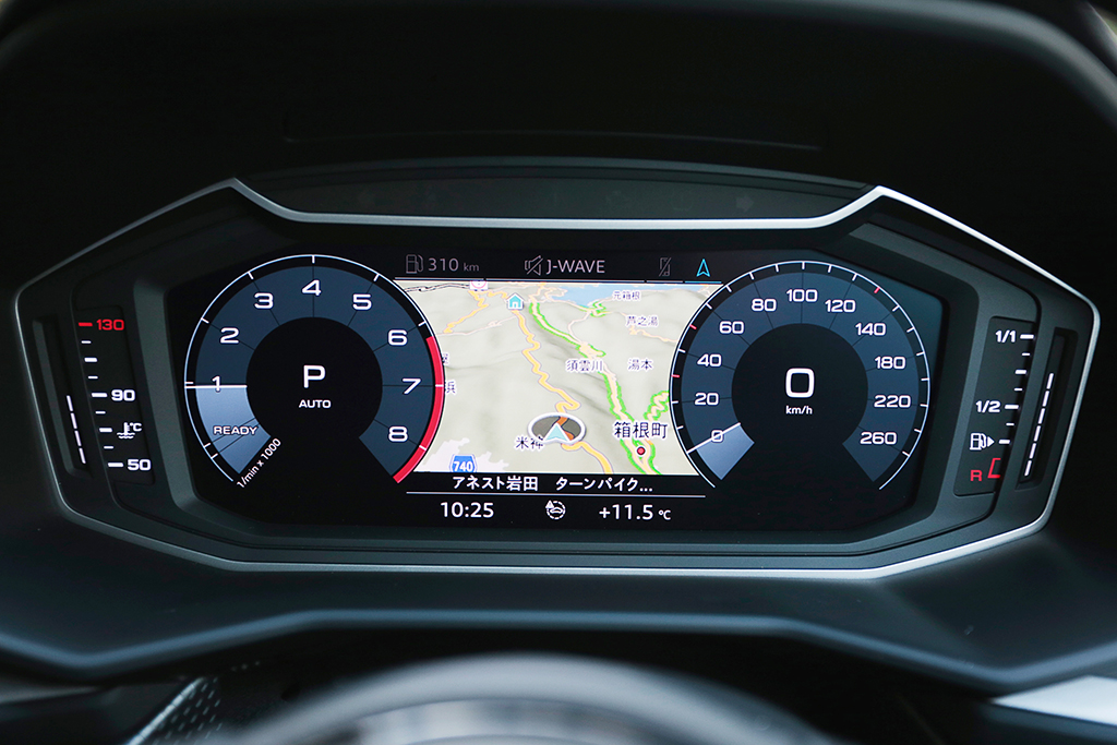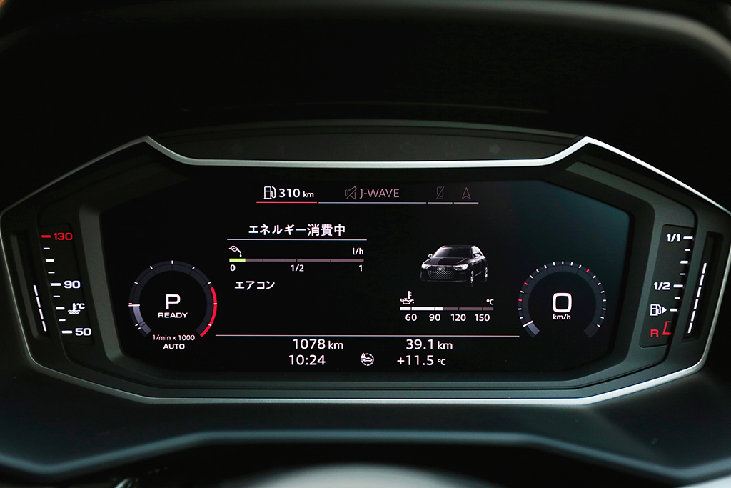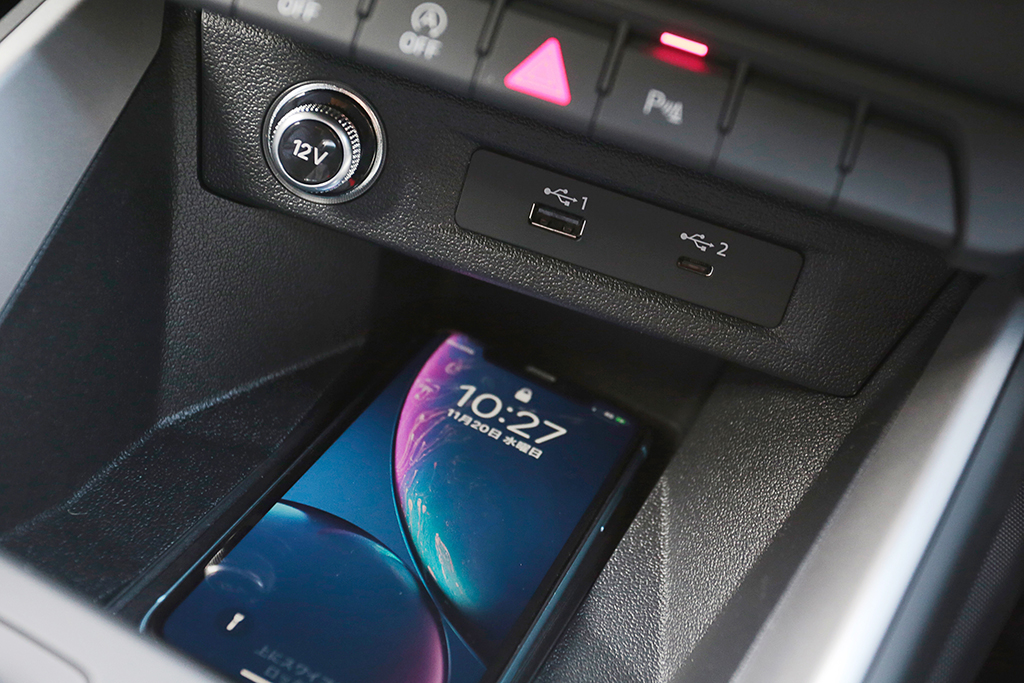 最新モデルらしく、中央の液晶ディスプレイに各種情報を表示するデジタルインストゥルメントクラスターを始め、Bluetoothのハンズフリー機能やUSB充電ポートを標準で備えます。ただし、スマートフォンを接続して音楽、ナビ機能ほかを活用する“アウディスマートフォンインターフェース”や、置くだけでスマホを充電できる“ワイヤレスチャージング”はオプション扱い。