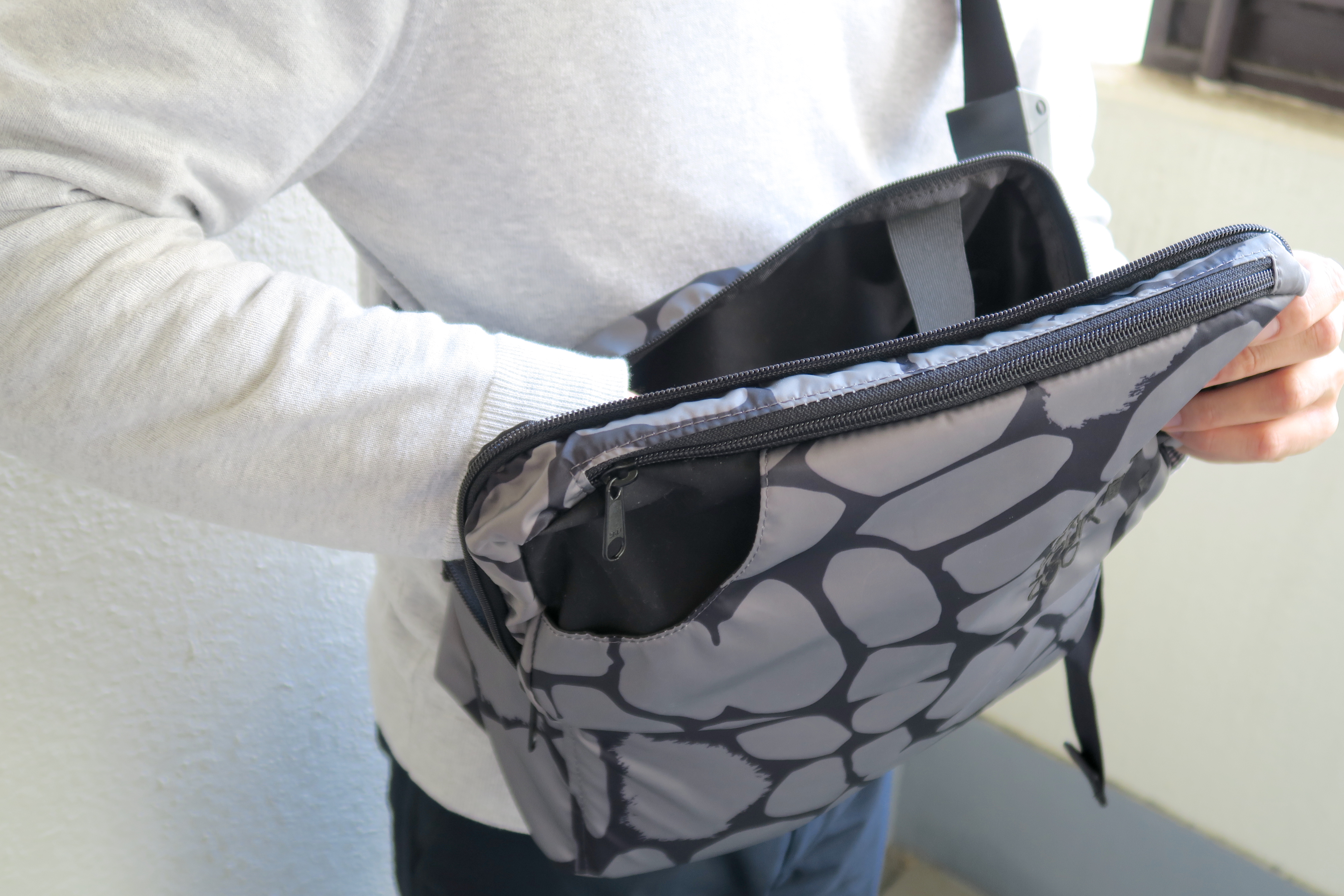 しかし、MAKE ART YOUR ZOOのメッセンジャーバッグは、バッグを掛けたときに自分のほうに向かってフタが開きます。これならフタが目隠しになってくれるので、カバンをごそごそしても、人に見られる心配がありません。