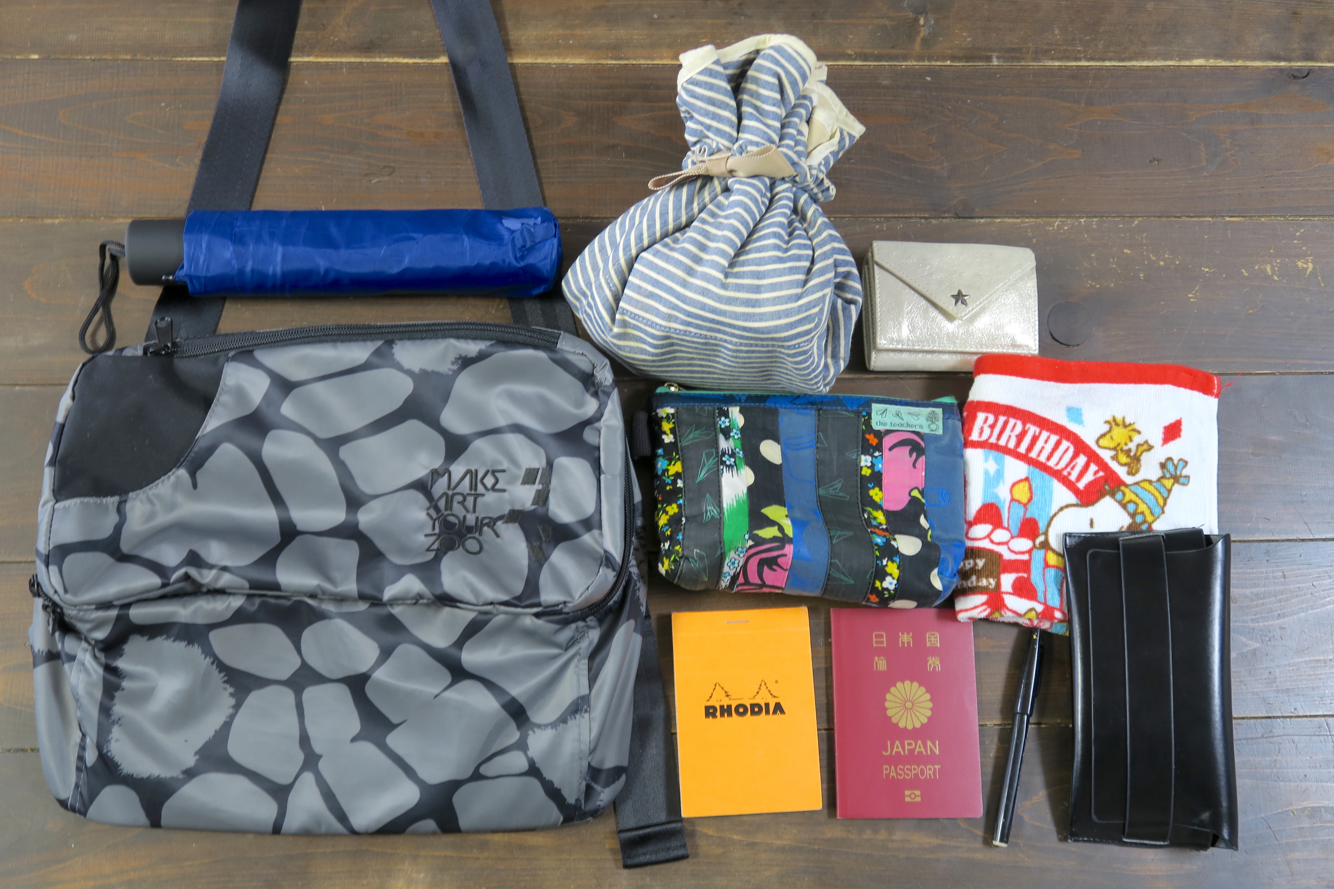 ▲持ち歩くものはこんな感じ。折りたたみ傘、ミラーレス一眼、財布、モバイルバッテリーや薬を入れたポーチ、タオル、メモ帳、ペン、サングラス