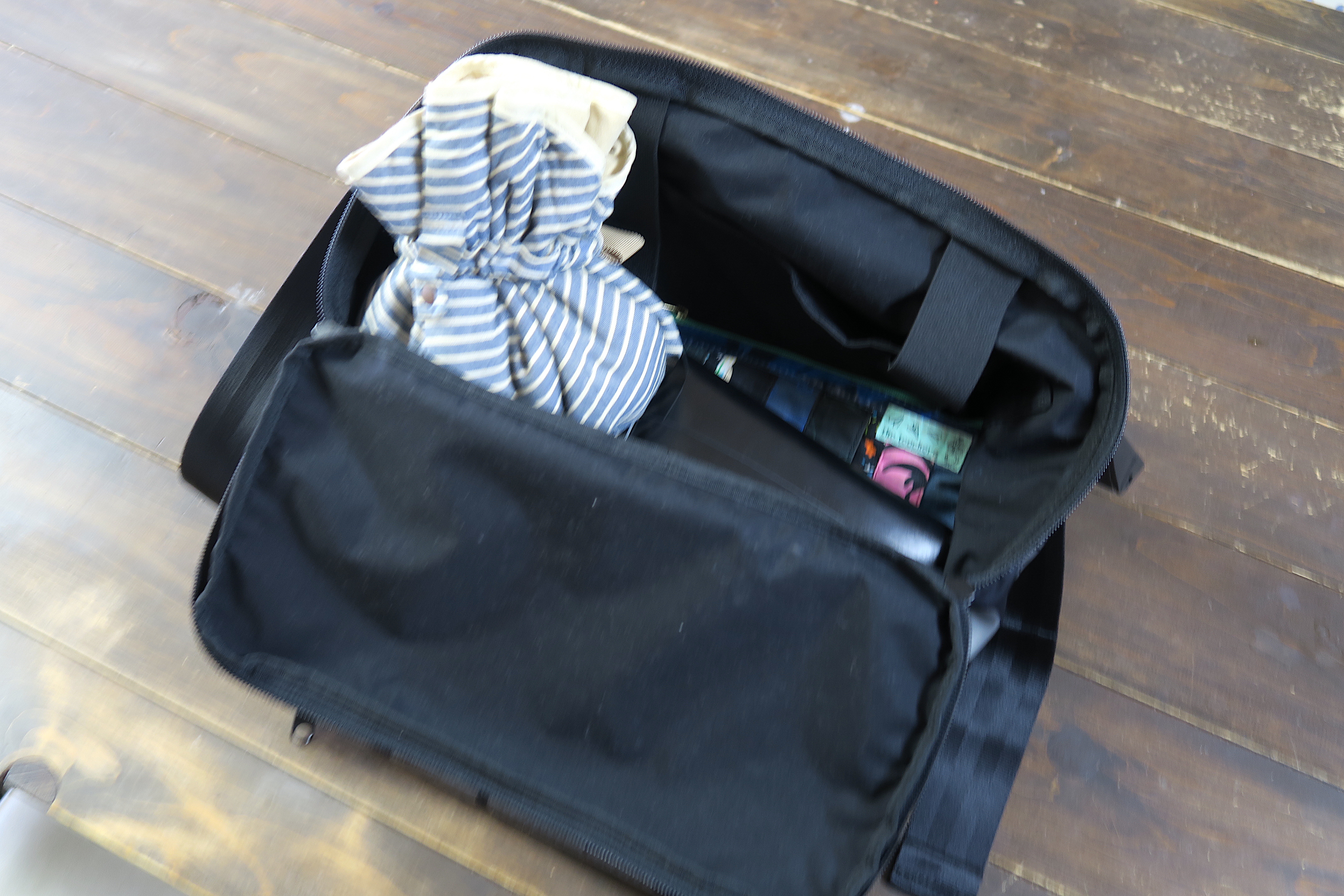実際に使い始めて「これはいい」と思ったのが、収納力の高さ。パッと見た感じは一般的なメッセンジャーバッグにしか見えないし、ショップスタッフに「意外と荷物が入るんですよ」と言われても「へー」くらいにしか思っていませんでした。