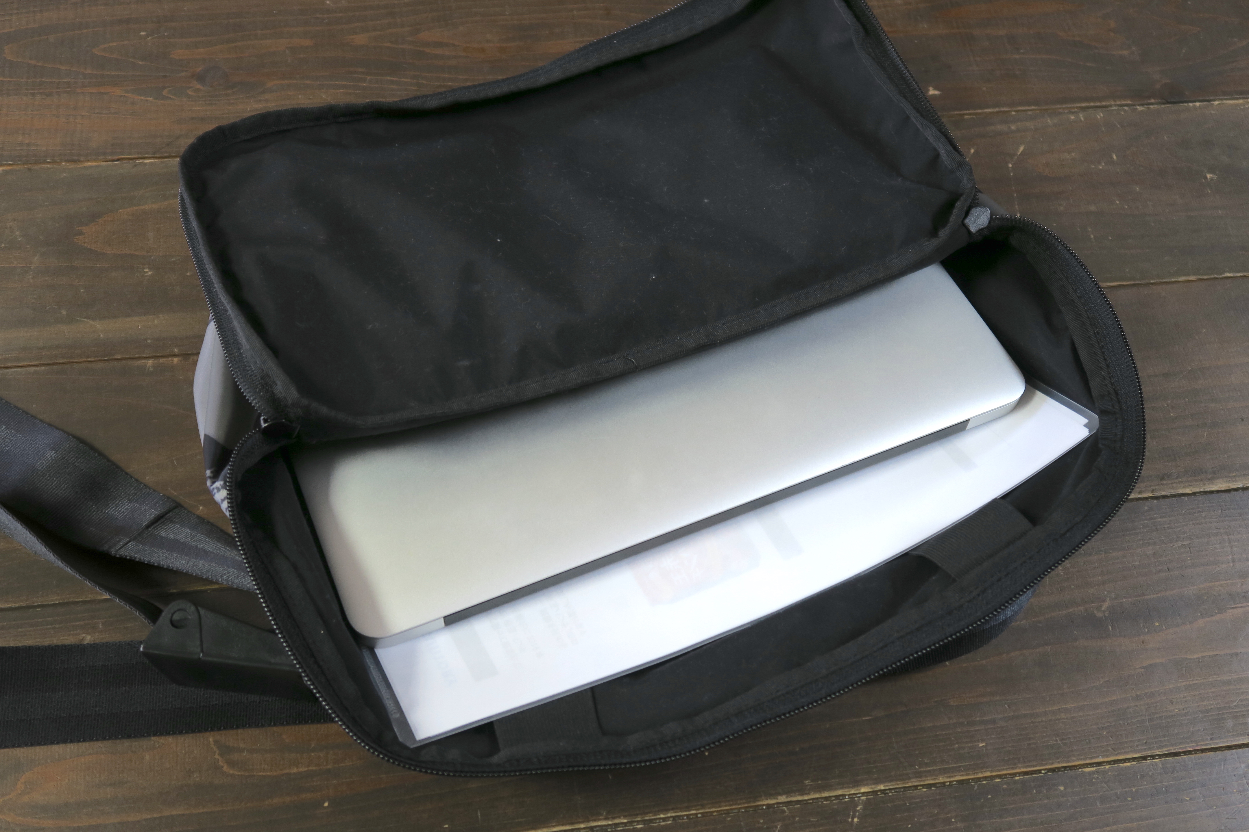 また、フラットな状態で使えば、A4の書類やMacBook Air、iPadなども余裕で入ります。これなら旅先でPCを持ち運びたいときにも良さそう。なので、展示会の取材など、両手は空けつつノートやカメラをすぐに取り出したい場面でも、このメッセンジャーバッグを使うことにしました。
