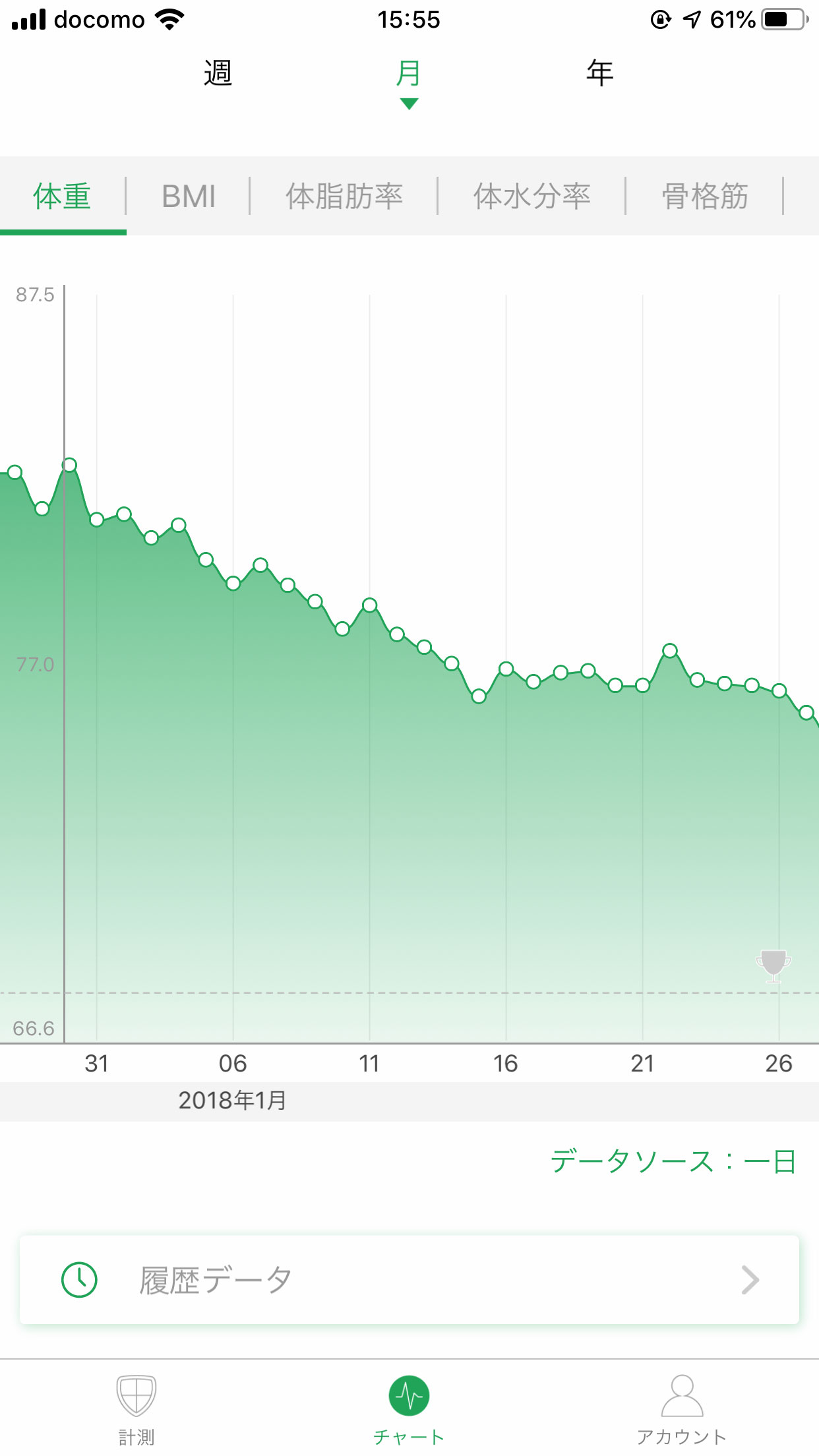 体脂肪率25%から24.6%まで、0.4%の減少に成功した! ↑UP