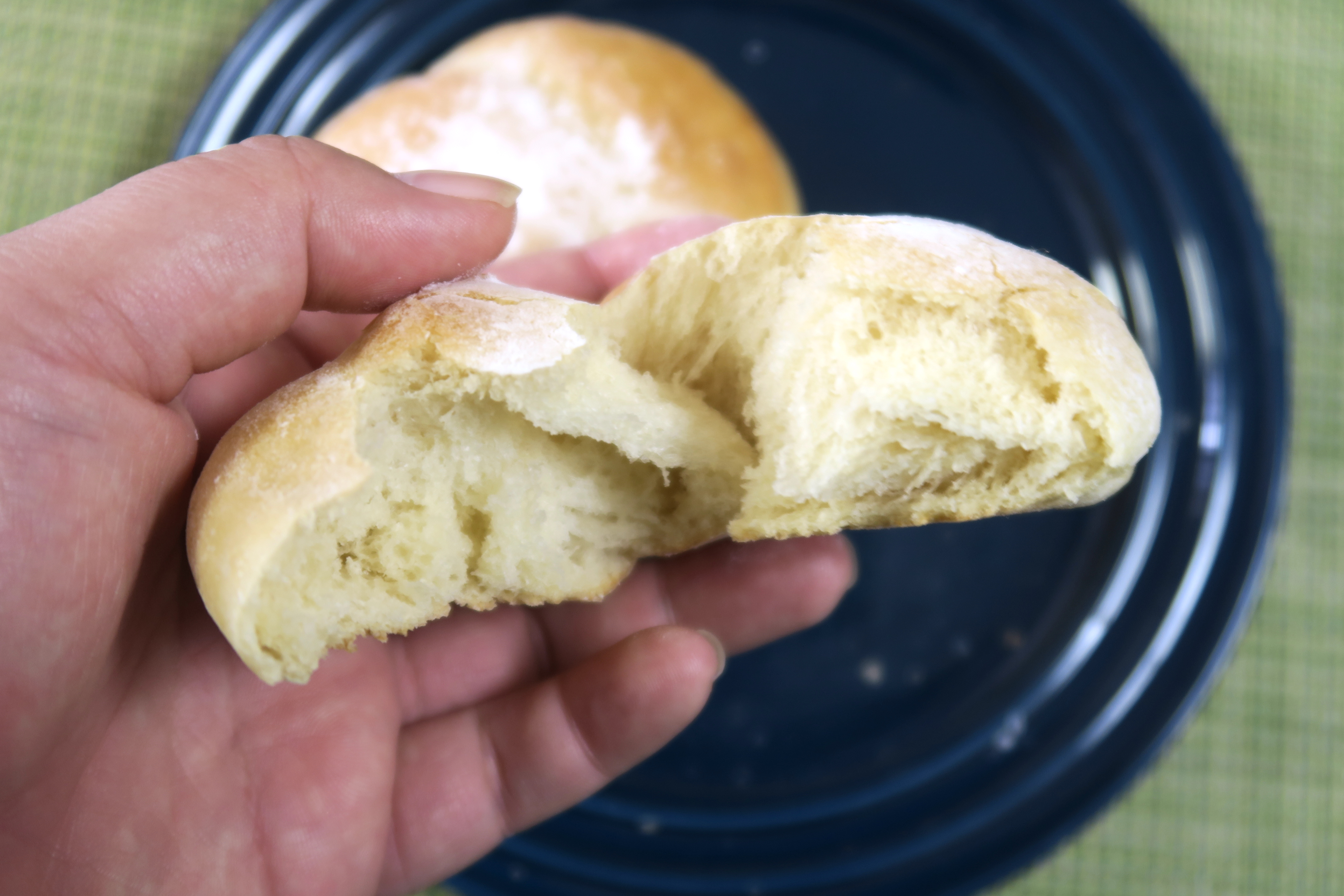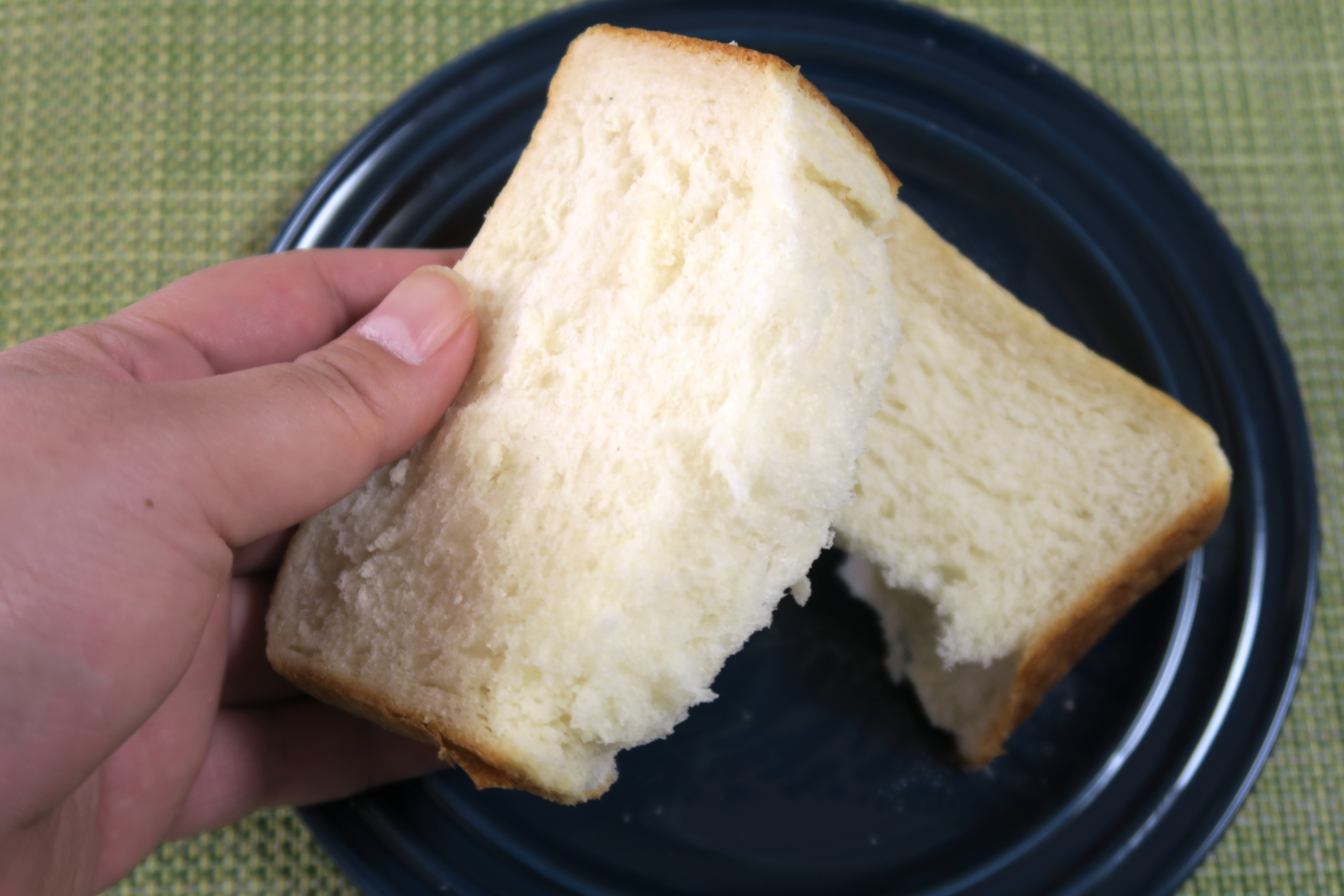 加熱し終えた白パンを食べてみると、表面は少し焼けている感じがするのですが、中はふわふわになっています。普段温めようとすると表面を焦がしがちなので、焦がさずにこれだけしっとりした仕上がりになるのは初めてかもしれません。