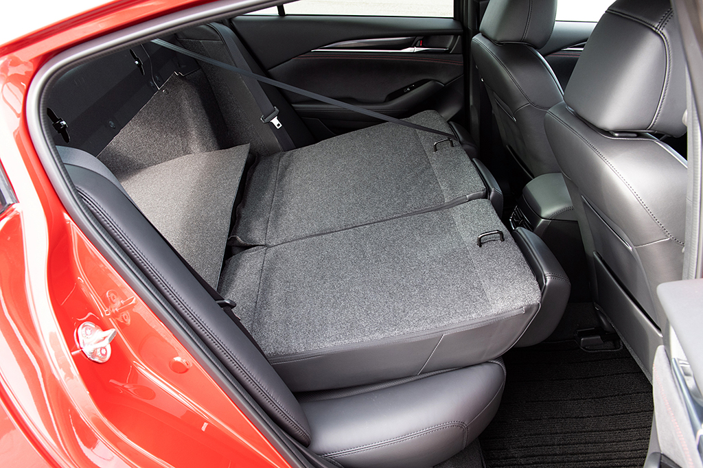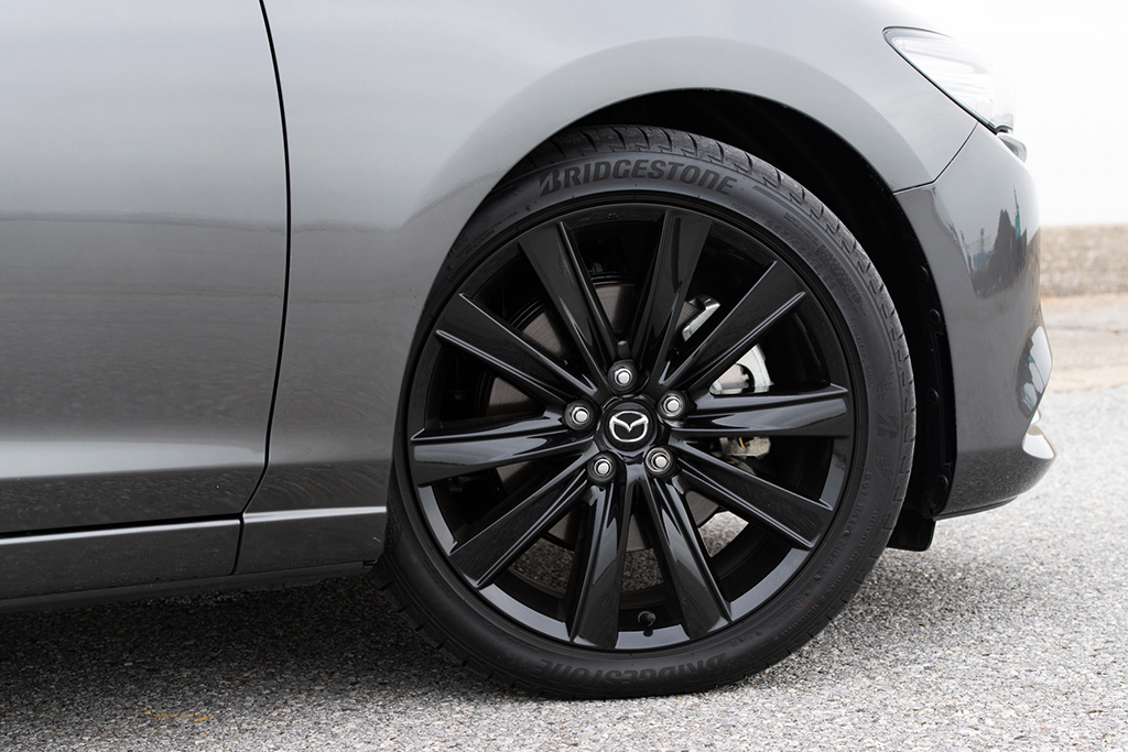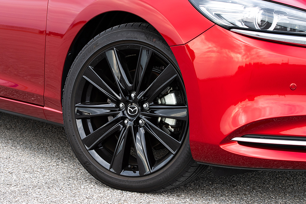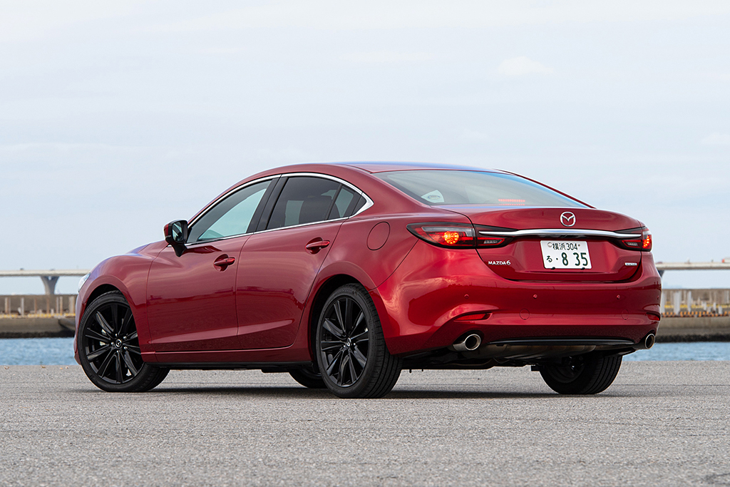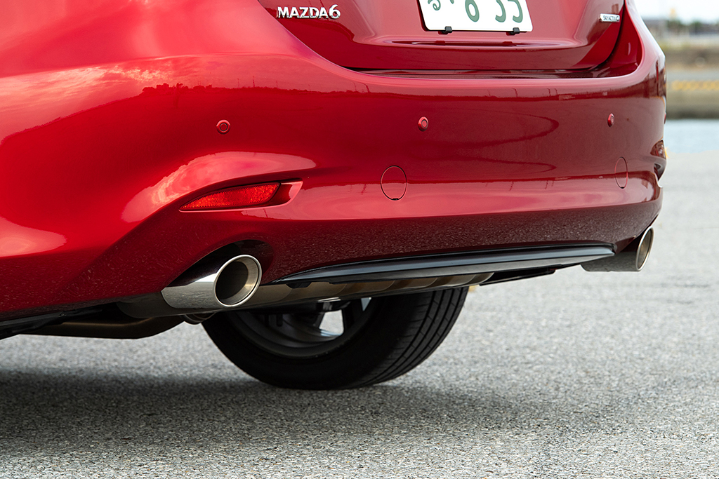 ちなみにボディサイズは、セダンが全長4865mm、全幅1840mm、全高1450mm。ワゴンはそれぞれ4805mm、1840mm、1480mmという数値で、基本的には前身のアテンザと共通です。ただし2.5ターボ車は、ブレーキサイズの大径化、トランスミッションのファイナルギヤ比の低速化など、エンジン性能の向上合わせた変更を受けています。