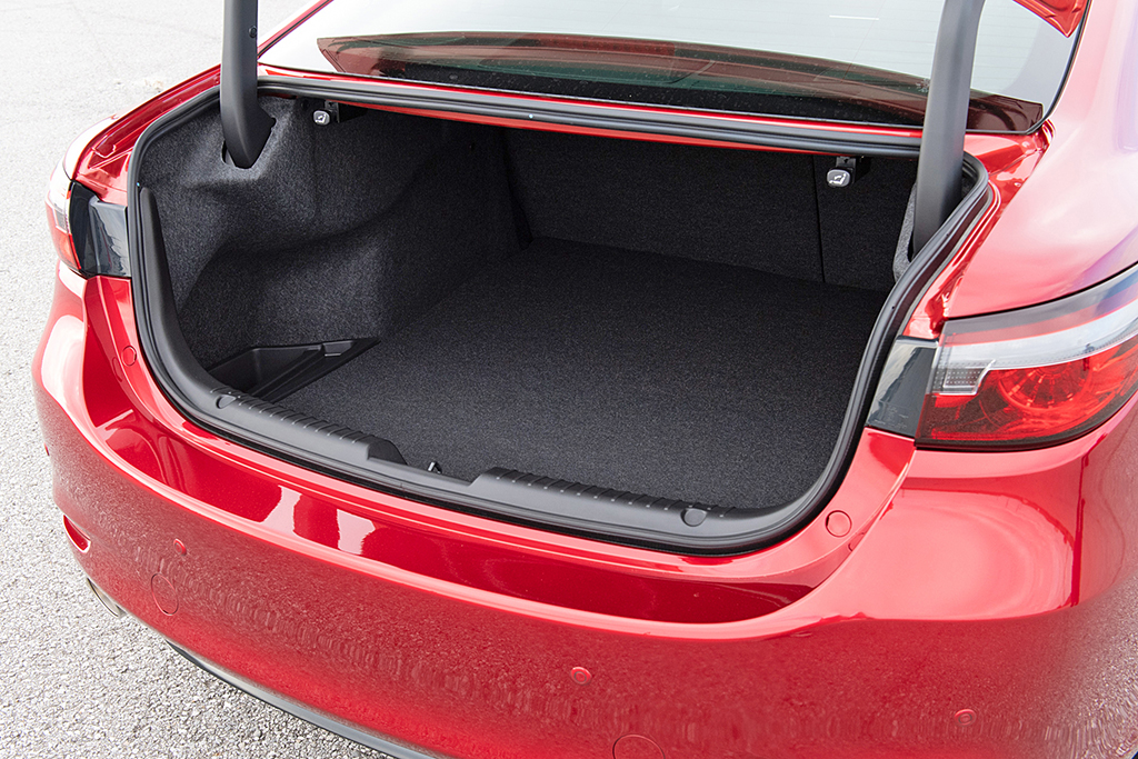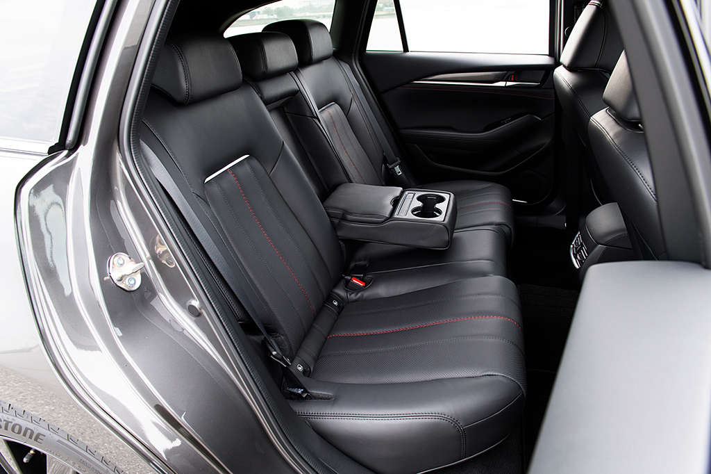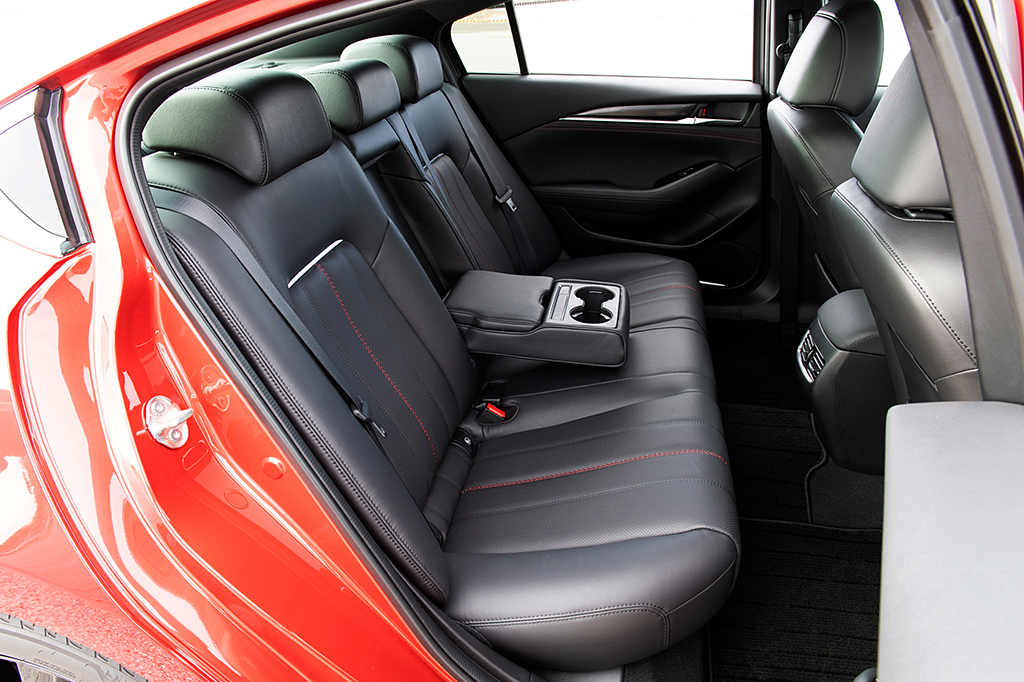 スカイアクティブ-G 2.5T車は、レザーシートに赤いステッチがあしらわれたり、ダッシュボード中段にスエード調素材が用いられたりと、ちょっとした装飾が施されていますが、派手さを抑えた演出という塩梅で、オトナが乗っても気恥ずかしさを覚えることはありません。昨今、ミドルクラスのサルーンやワゴンでも、個性的なインテリアを備えたモデルがありますが、マツダ6のプレーンなデザインは視覚的に疲れることもなく、接すれば接するほど好ましく思えてきます。
