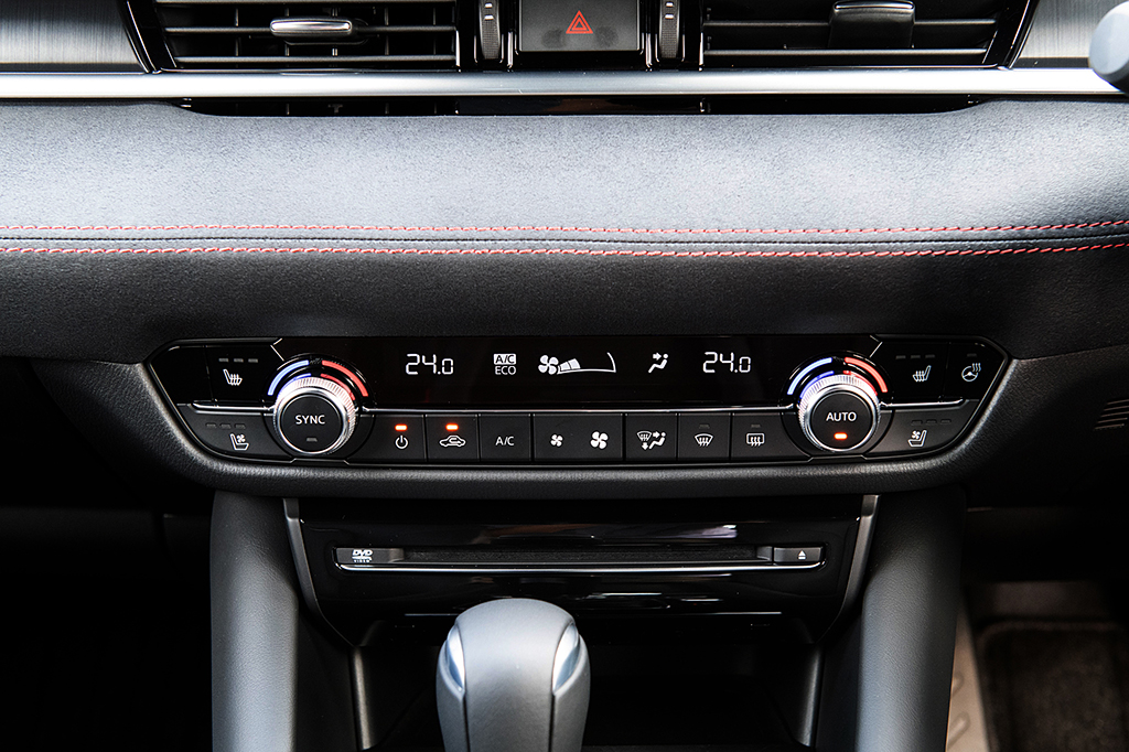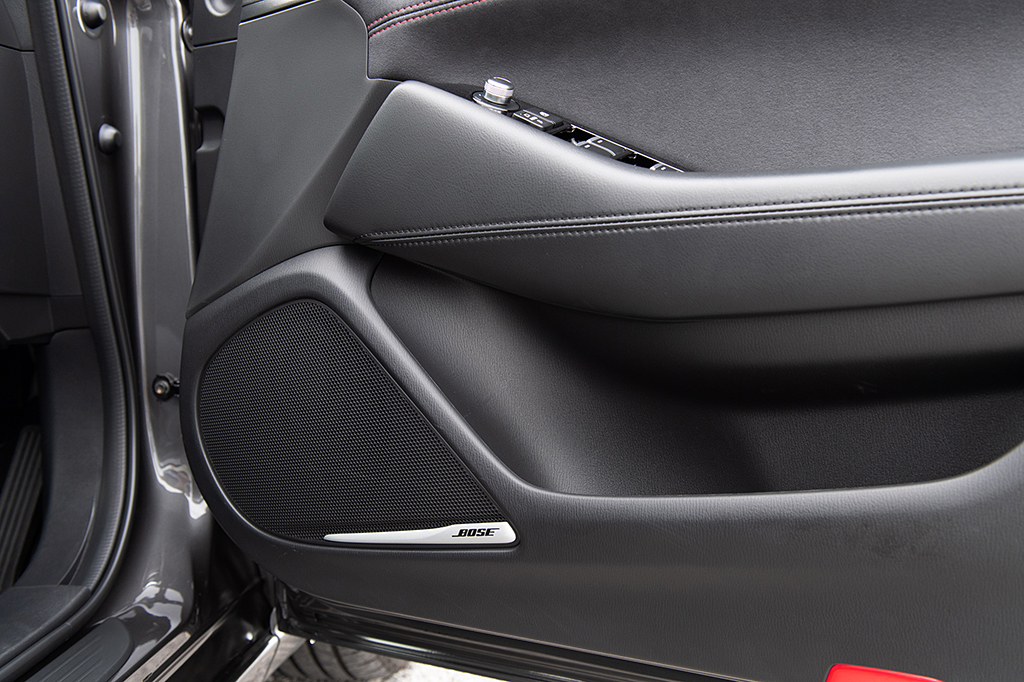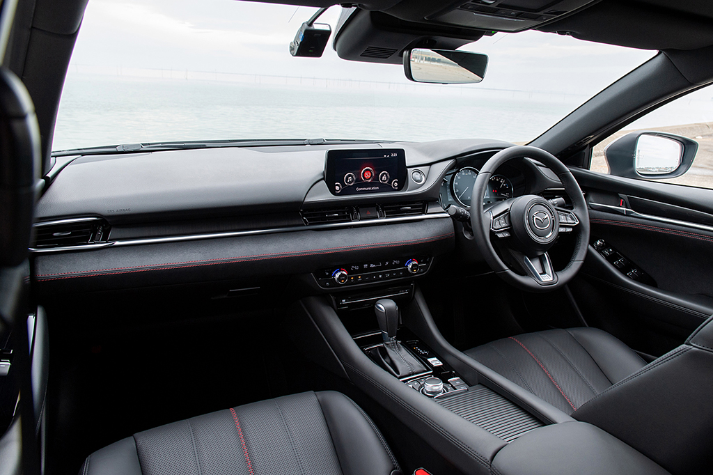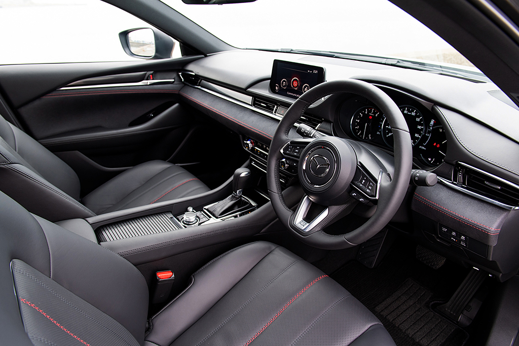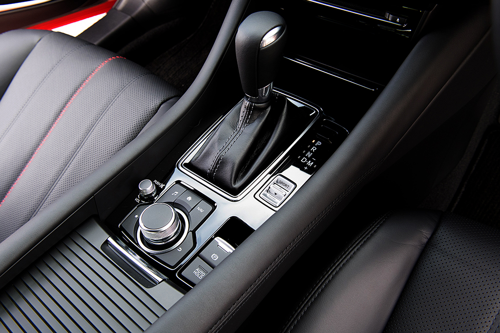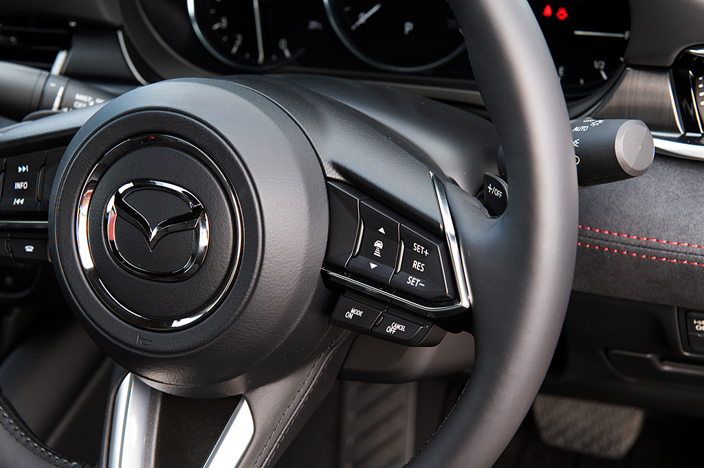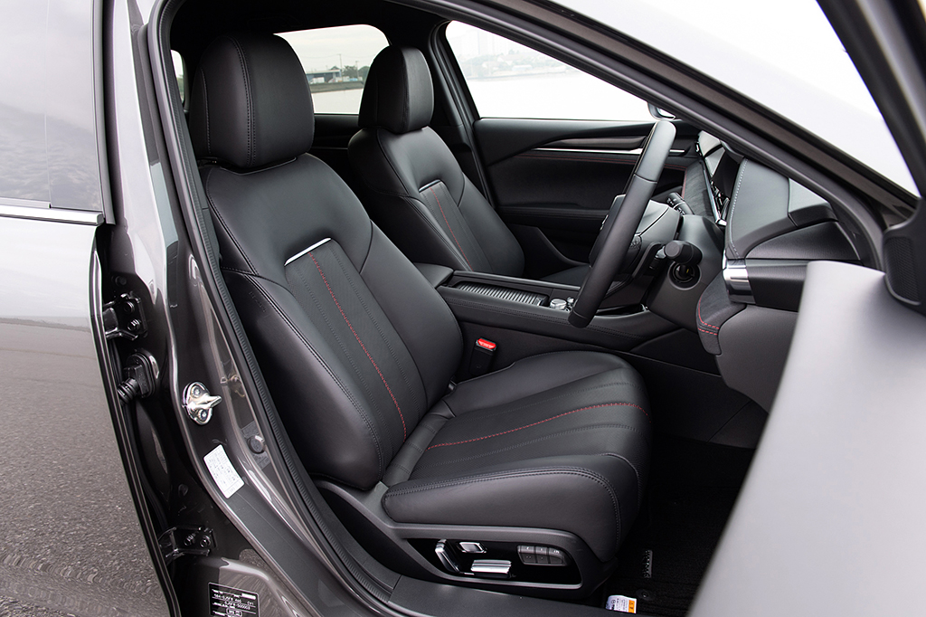 運転席に納まって真っ先に感じたのは、マツダ車らしく奇をてらうことのないインテリアから受ける安心感。さらっとした手触りのステアリング、肩回りや腿の裏までしっとりとフィットするシート、ドライバーズカーにふさわしいシンプルで見やすいメーターやダッシュボードのデザインなど、パーツをひとつひとつ見ていっても、十分に満足できる仕上がりで、全体のまとまりの良さもフラッグシップならではのレベルにあります。