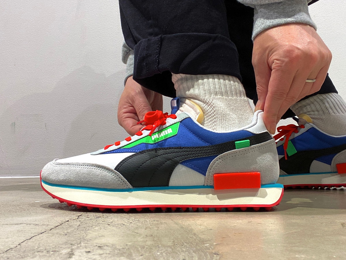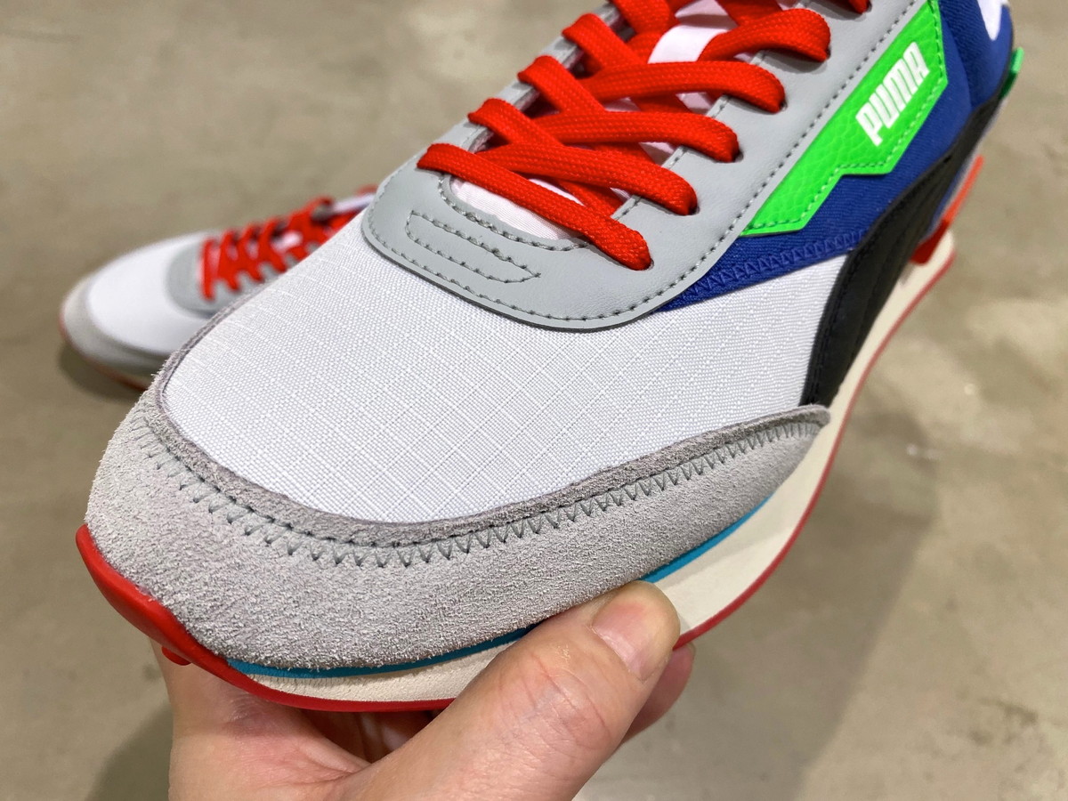 アッパーはリップストップナイロンをメインに、オーバーレイはスエードやレザーと使い分けて、メリハリのある印象へと仕上げられています。