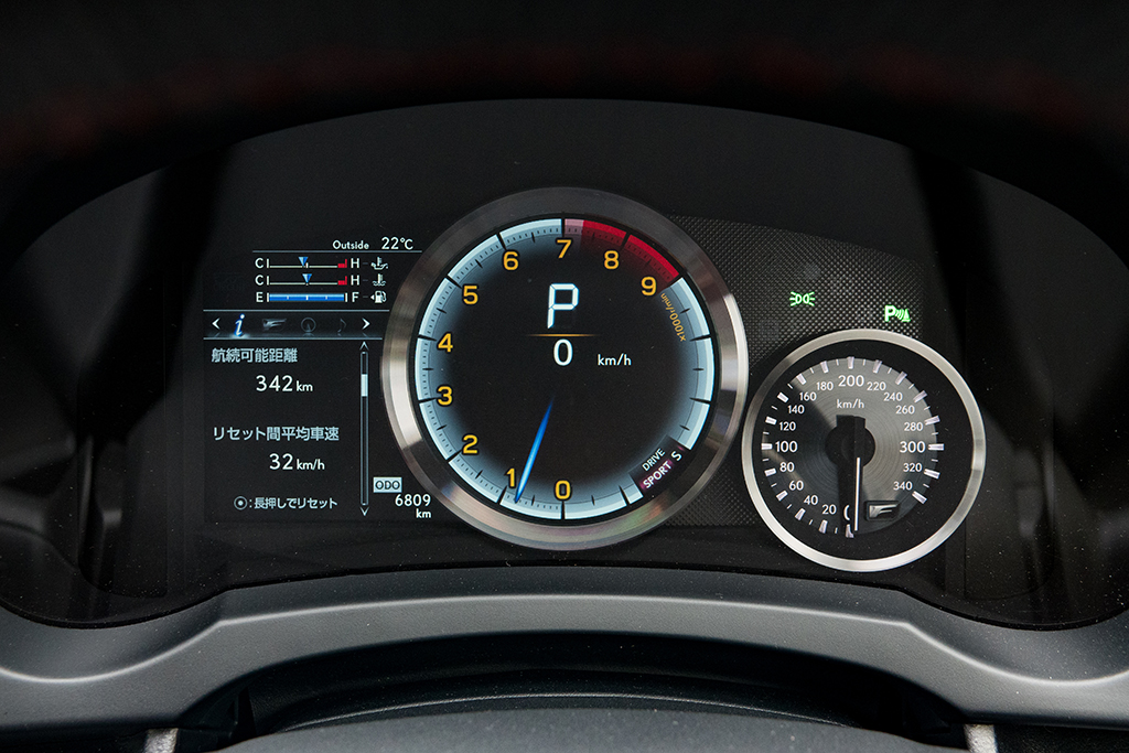 RC Fの心臓部は、NAの5リッターV8エンジンで、最高出力は481馬力、最大トルクは54.6kgf-mを発生する。最高出力の発生回転数は7100回転で、ターボ全盛の今となっては常識外れの数値。また、予想通りとでもいおうか、燃費データはカタログ記載のWLTCモードで8.5km/Lと、この時代においては思わず二度見してしまうほどのスペックを掲げる。
