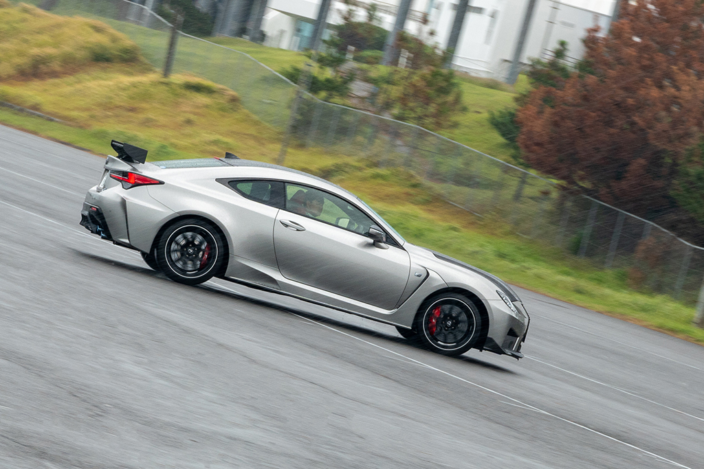 ベースモデルとなったRCは、レクサスのコンパクトセダン「IS」のクーペバージョンと思われがちだが、冷却系のユニットなどには、ひと回り大きいセダン「GS」と同じものを使用。またシャーシ中央部には、剛性面で優れるかつての「IS C」のそれをドッキングするなど、走行性能を高めるための工夫が見て取れる。そんなRCをベースに、サーキットでの限界走行をも視野に入れて作られた、ハイエンドモデルのRC Fというわけだ。