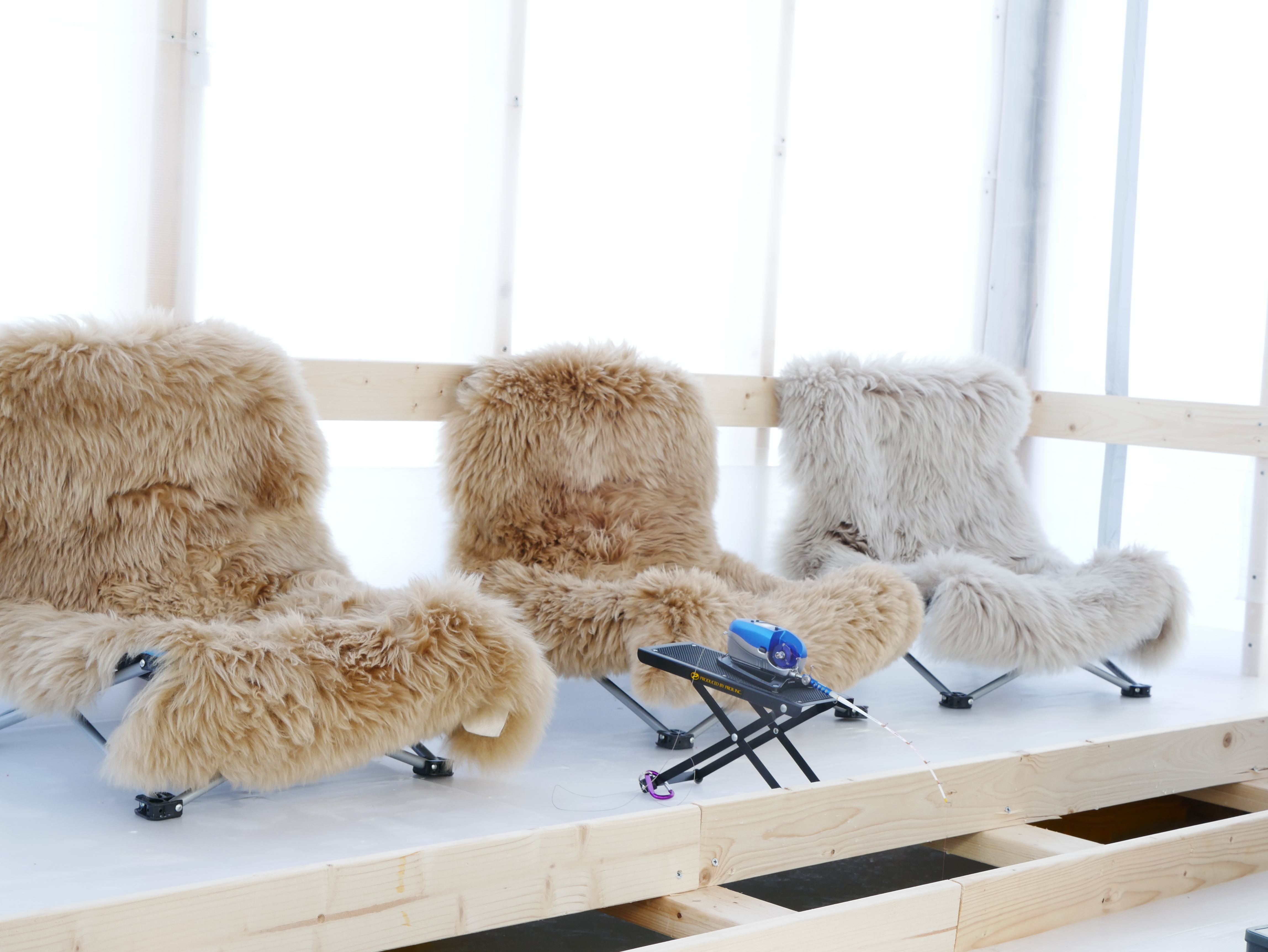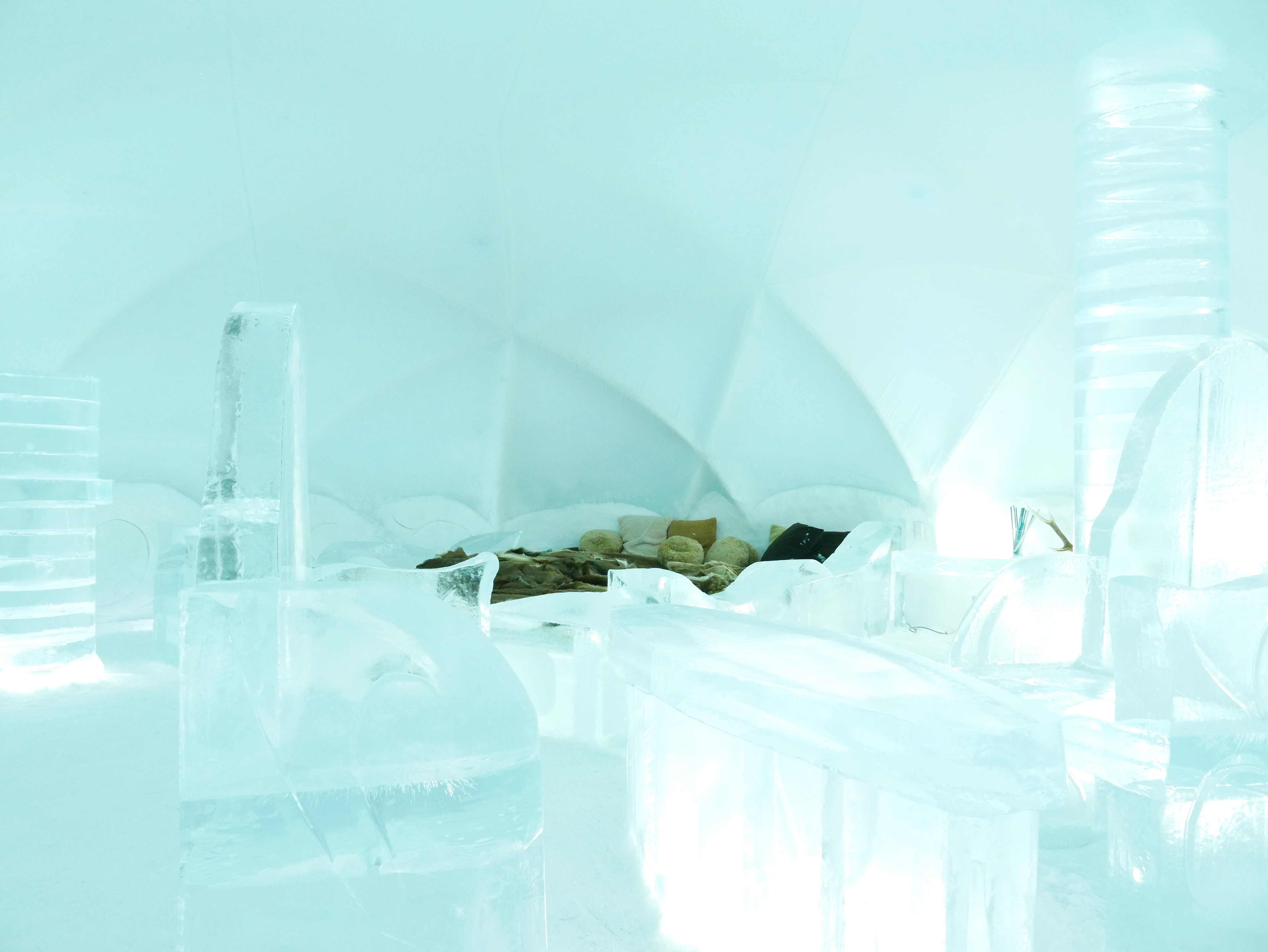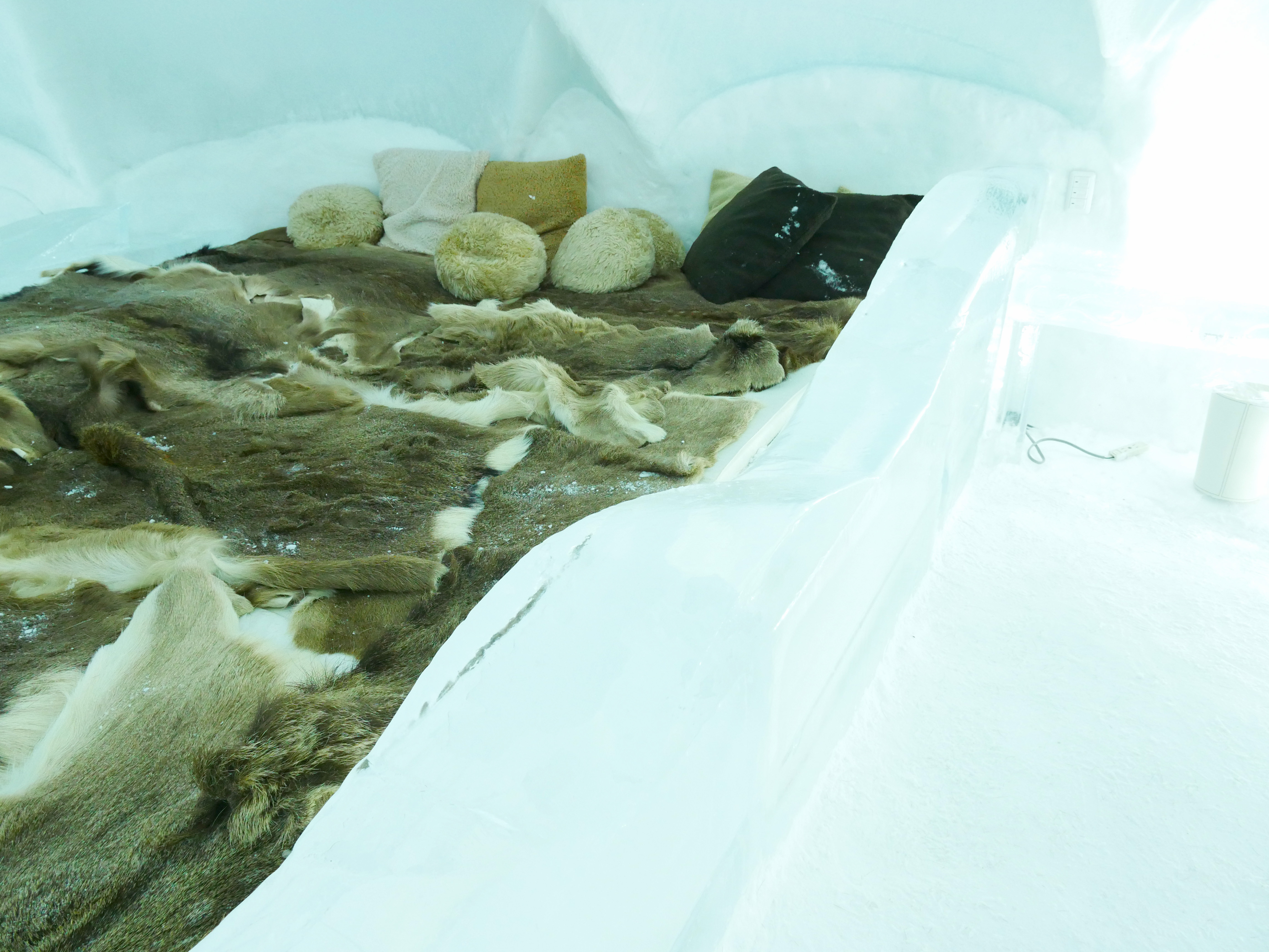 室内気温は氷点下4℃。外気が氷点下15℃だったこともあり、かなり暖かく感じます。室内の調度品、ソファもテーブルもベッドも何もかも氷。鹿の毛皮が敷き詰められたキングサイズのベッドが妙にラグジュアリーな雰囲気です。ちなみに、就寝時は氷点下30℃以下寒冷地対応の寝袋で寝るので、まったく寒くない(むしろ少し暑い)のだそう。