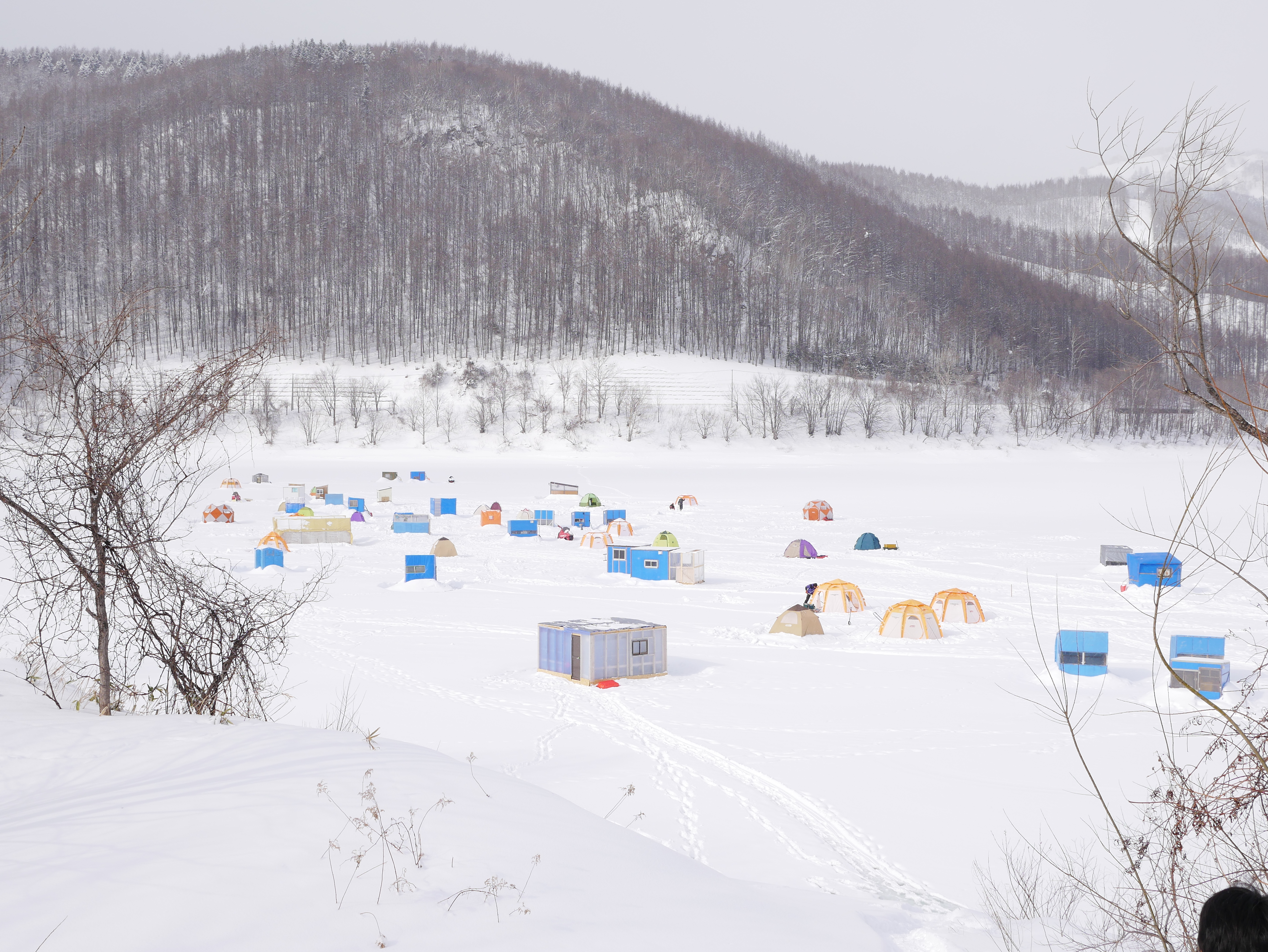 氷に覆われたかなやま湖。釣りを楽しむテントがいっぱい!