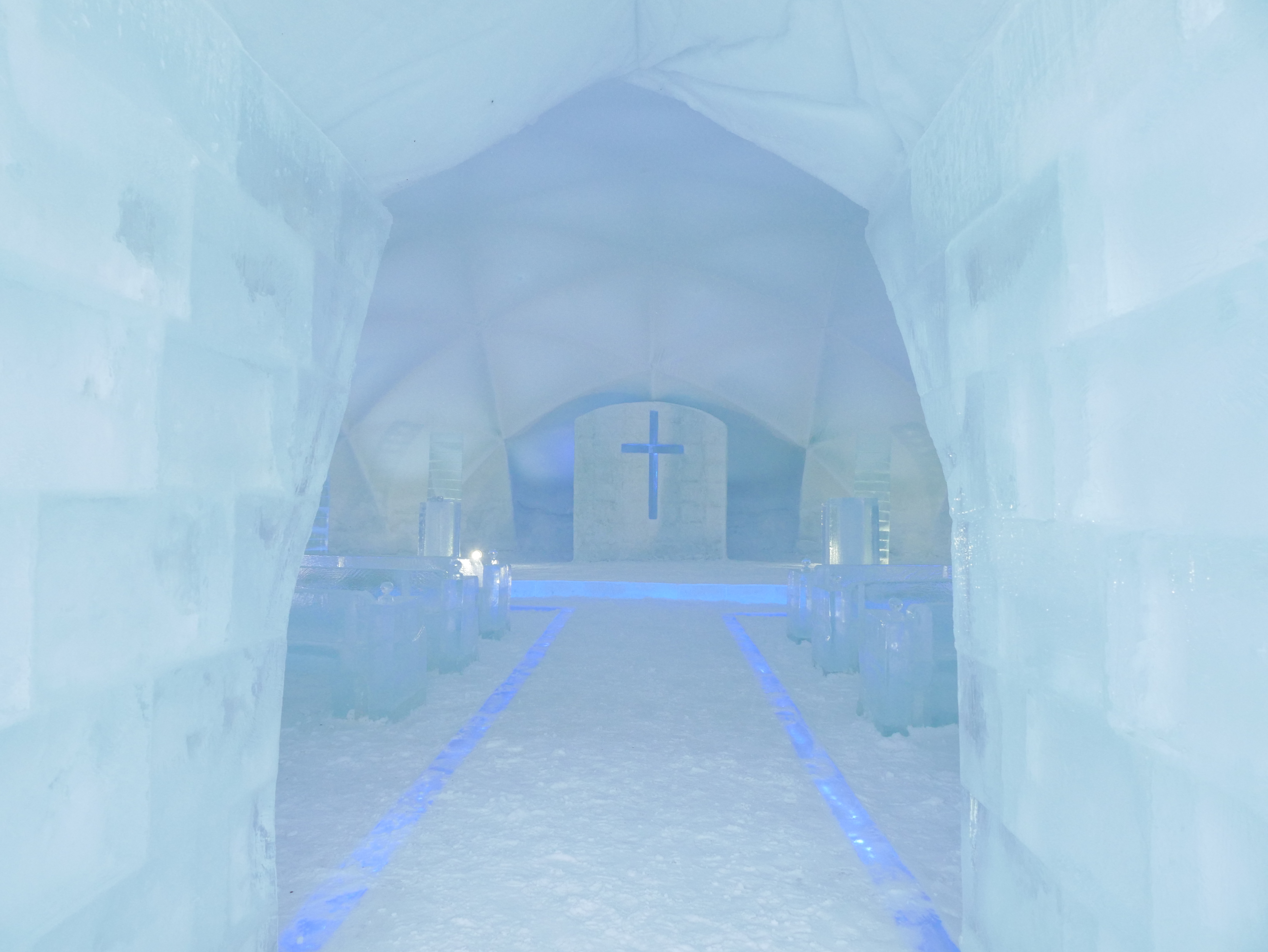 メインストリート沿いに並ぶのは、氷でできたお店で熱々チーズフォンデュが楽しめる「氷のレストラン」や、氷のグラスで味わうカクテルが格別だという(寒過ぎてなかなか酔えないらしい)「氷のバー」など。街の一番奥には、バージンロードから参列者席まですべて氷でできているチャペル「氷の教会」が。