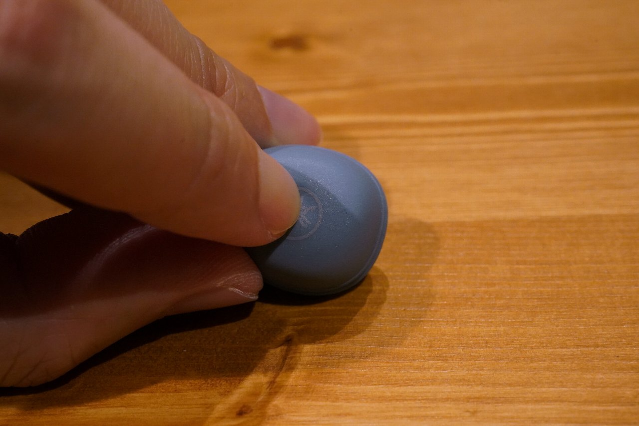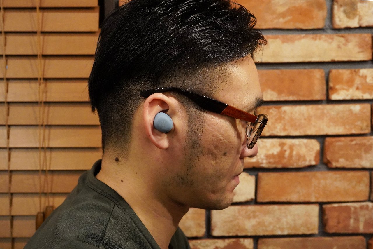 イヤホン本体は、丸みを帯びたナチュラル系のデザイン。今回試したスモーキーブルーは、日本のメーカーらしい控えめなトーンです。片側6.1gとサイズは少し大きめですが、装着したデザインもさほど目立ちません。
