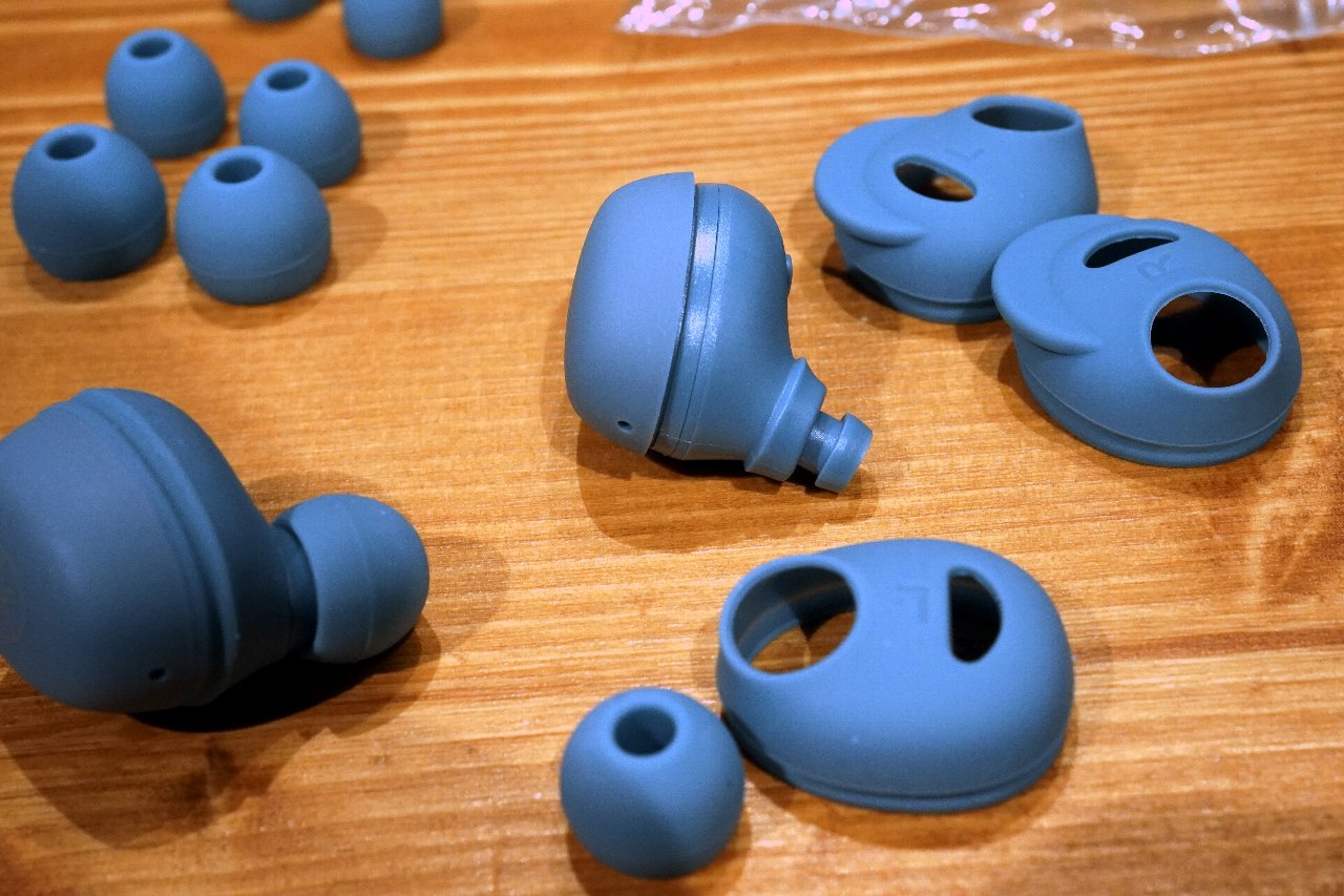付属のイヤーピースはSS/S/M/Lで、フィット感の調整に小さな固定用フィンの付いたスリーブの交換も可能。そのままでは支えがなく、かつ耳へと強力にフィットするタイプではないので、落下が心配ならフィン付きスリーブへの交換を推奨します。なお、保護等級IPX5相当なので雨濡れ程度なら問題ありません。