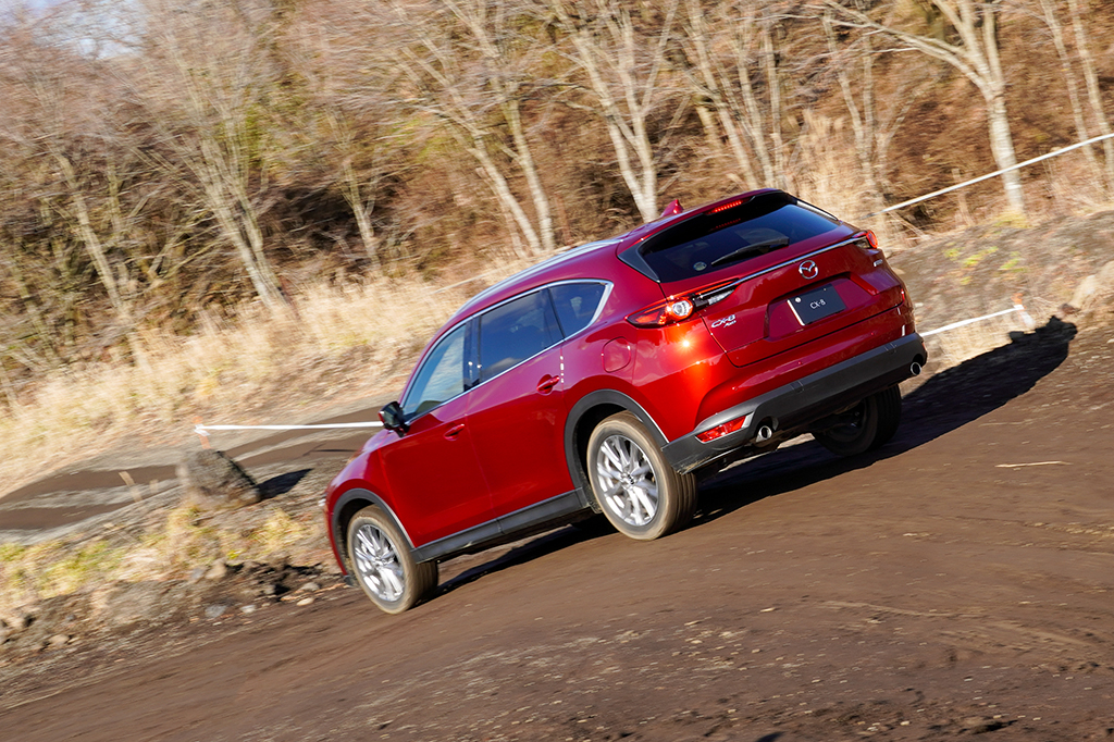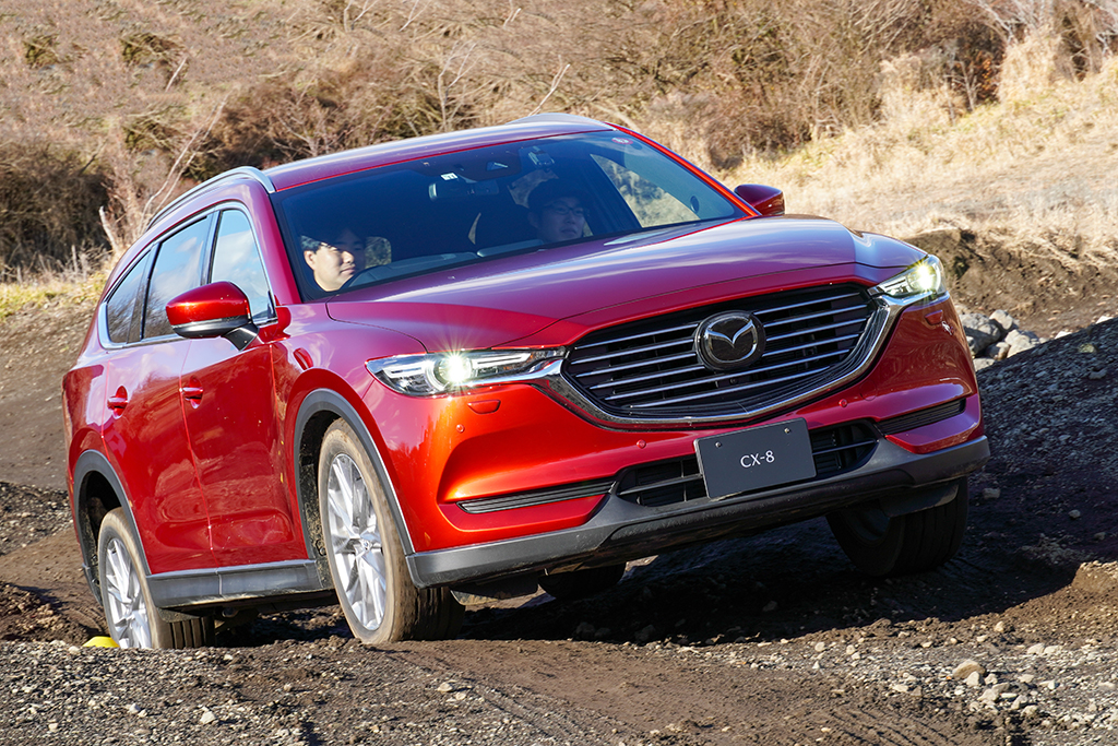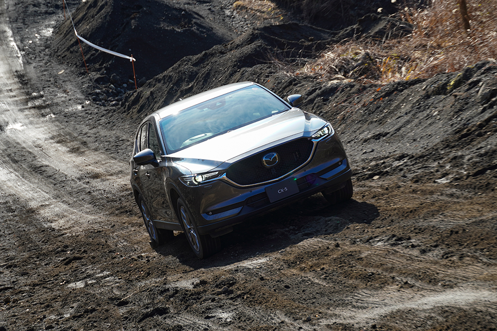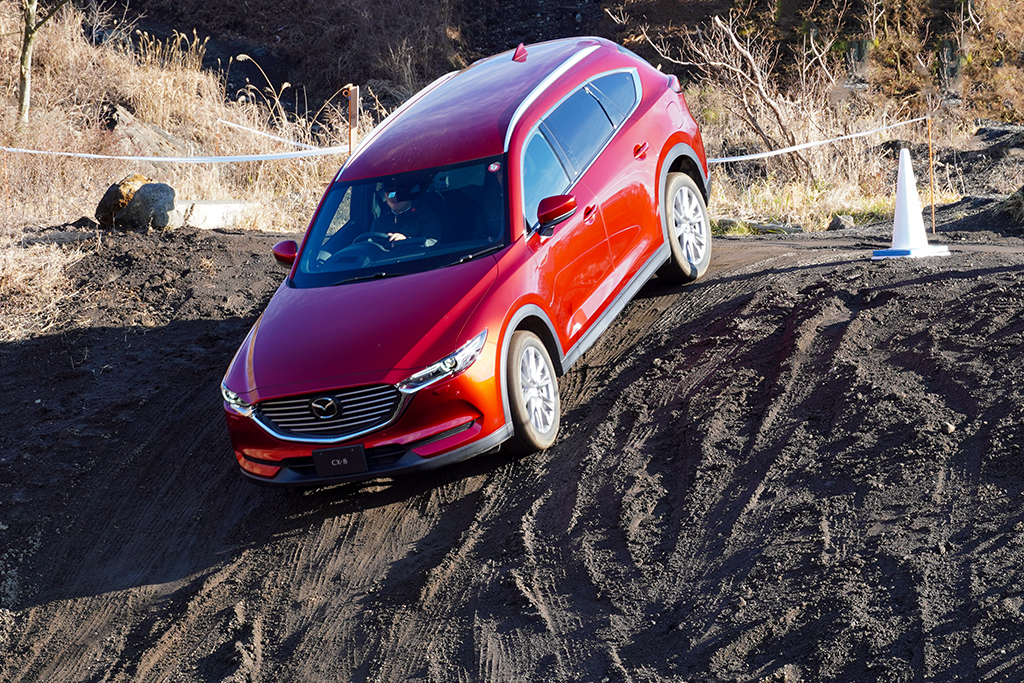 続いて、CX-8とCX-5で本格的なオフロードコースへ向かう。本格オフローダーを対象にしたコースは傾斜がきつく、路面もかなり荒れている。最初に説明を受けた時は「都会っ子のマツダSUVをここで試すのか?」と、正直、不安に思ったが、そんな予想は見事に裏切られた。2台はノーマルタイヤでも、驚きの走破力を見せてくれたのだ。