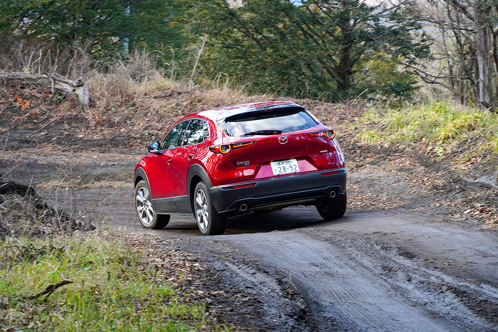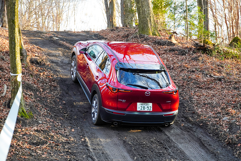 まずCX-30で、軽めのオフロードへとコースイン。最適地上高は175mmと、3台の中では最もクリアランスが小さいため、激しい悪路をガンガン走行するのは難しい。それでも、普通の使用シーンではなかなかお目にかかれない、少しぬかるんだ悪路を涼しい顔で走破してみせた。