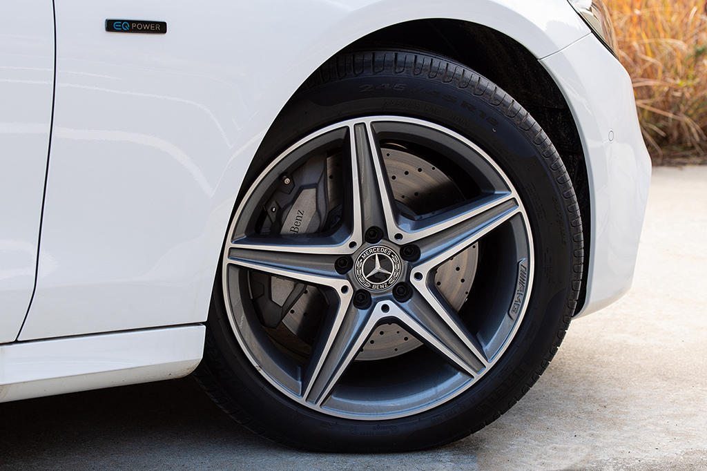 メルセデスはすでに、EV(電気自動車)の「EQC」を日本で販売していますが、そちらが未来的なルックスをまとうのに対し、E350deはフロントフェンダーに小さく「EQ POWER」のエンブレムが与えられる程度。遠目に一瞥しただけでは、PHEVであることすら分からないほど控え目なたたずまいです。
