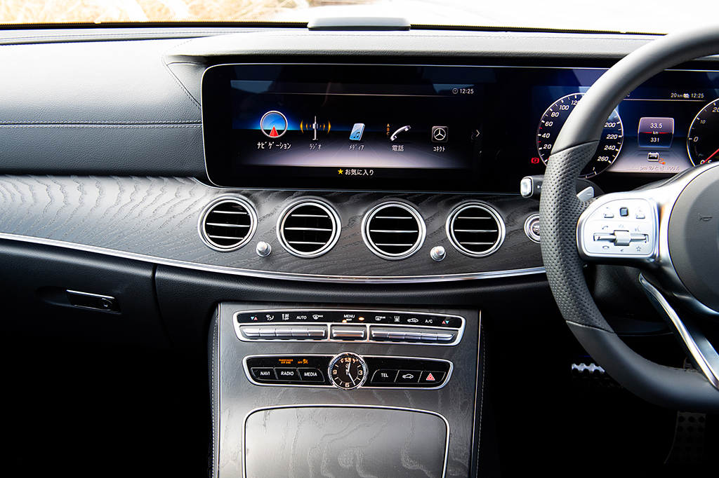 それらは、2リッター直4ガソリンターボエンジンを積むE300アバンギャルドスポーツに準じた設えですが、12.3インチの液晶ディスプレイを2枚用いたメーターパネルの表示に目をやると、このクルマが“電気で走る”ことを認識させられます。