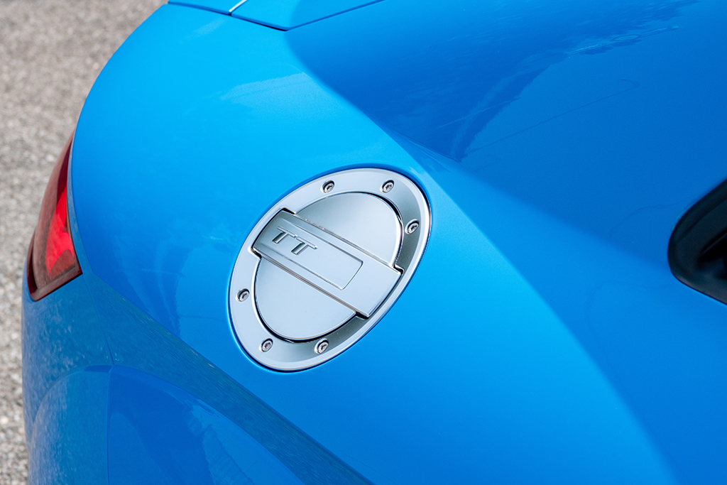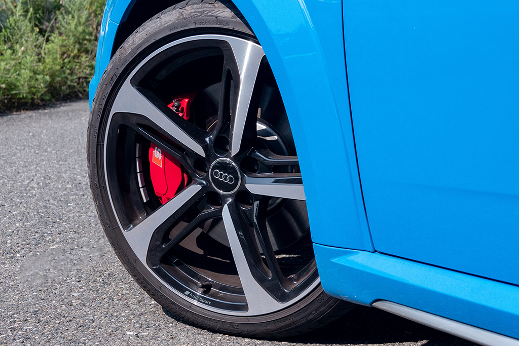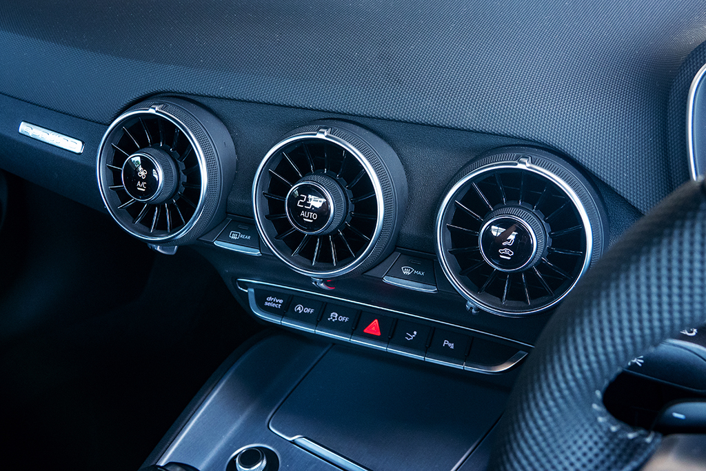 TTSのスタイリングは、スタンダードのTTとかなり異なる。TTSは、アルミをアクセントとしたマットブラック仕上げの専用のハニカムグリルや、同じくTTS専用の前後バンパーを装着し、TTとの違いをアピール。それでいて、ドアミラーはボディ同色ではなく、あえてシルバーでコーディネートし、TTRSほど武骨ではないものの、適度にスマートに仕立てられている。