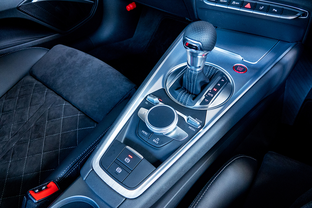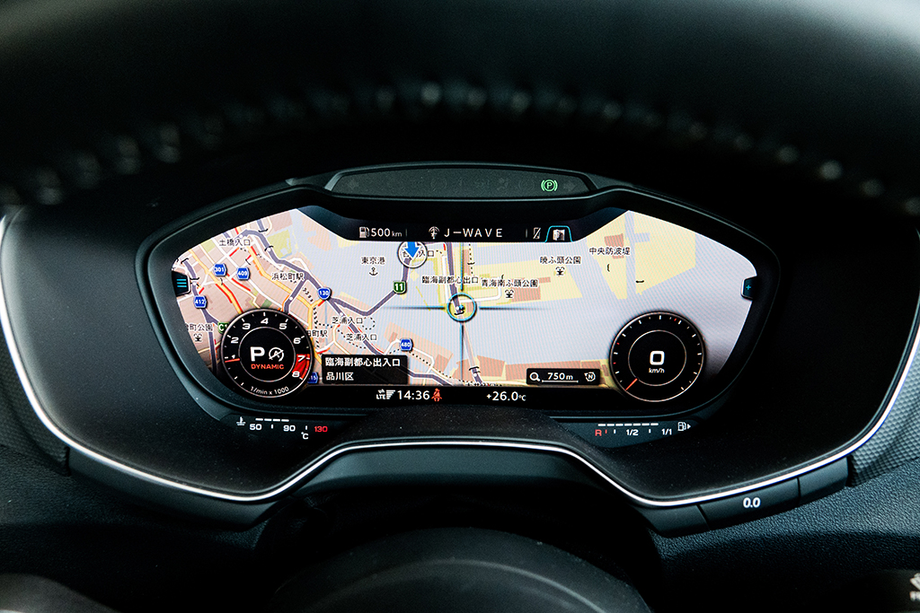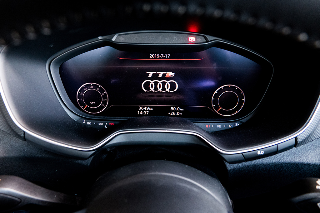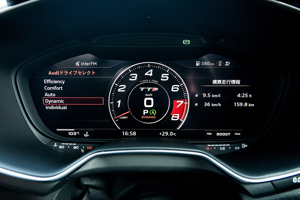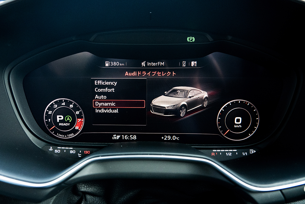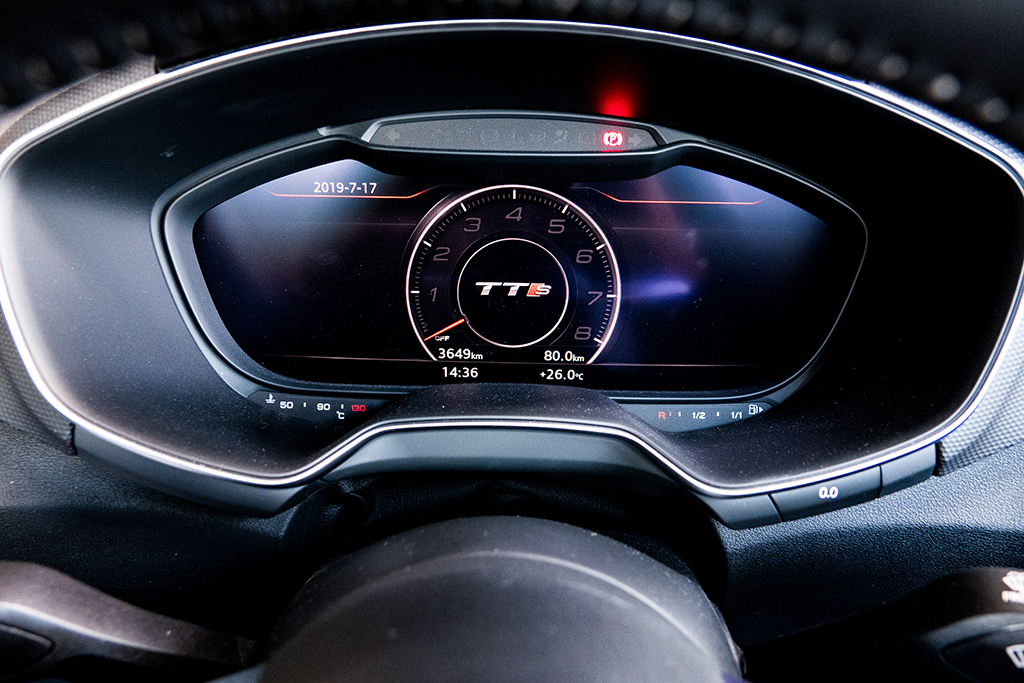 実際ドライブしてみると、この56馬力の差が結構大きい。特に違いを感じるのが、高回転域での盛り上がり方だ。高性能モデルをドライブすることの喜びのひとつとして、エンジン回転数が高まっていく際のフィーリングとパンチ力が挙げられるが、TTSのエンジンも、そこをしっかりチューニングしているのがうかがえる。TTと比べると、明らかに回転の上昇が鋭くて刺激的。その上、高性能モデルらしい太い排気音が、ドライバーの気分を高めてくれる。
