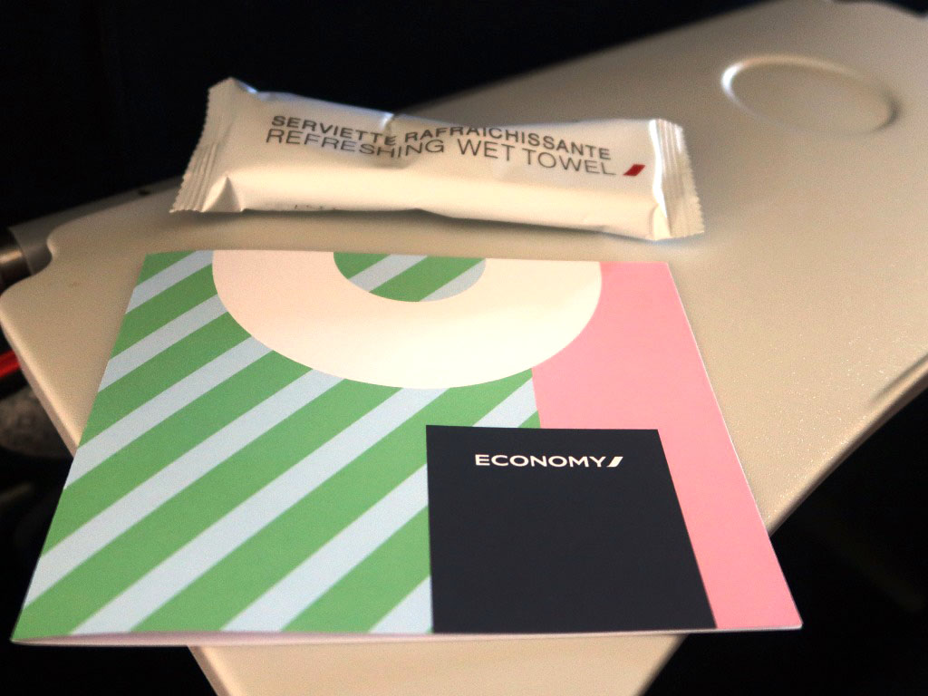 離陸後はけっこう揺れましたが、おさまったところでメニューとウエットタオルが配られました。