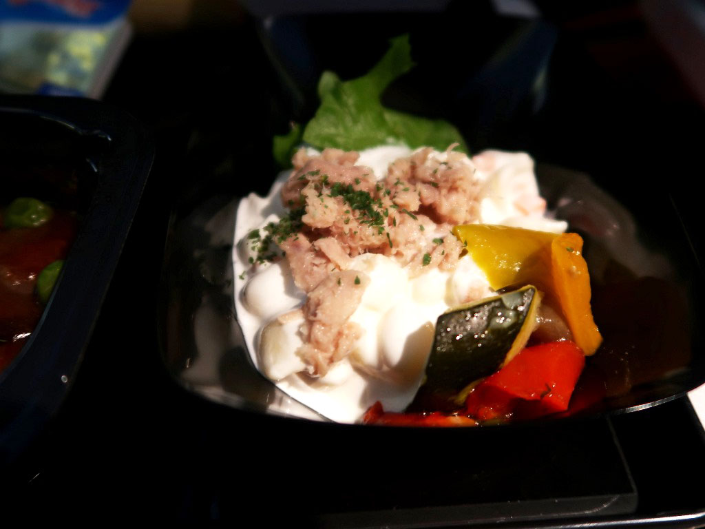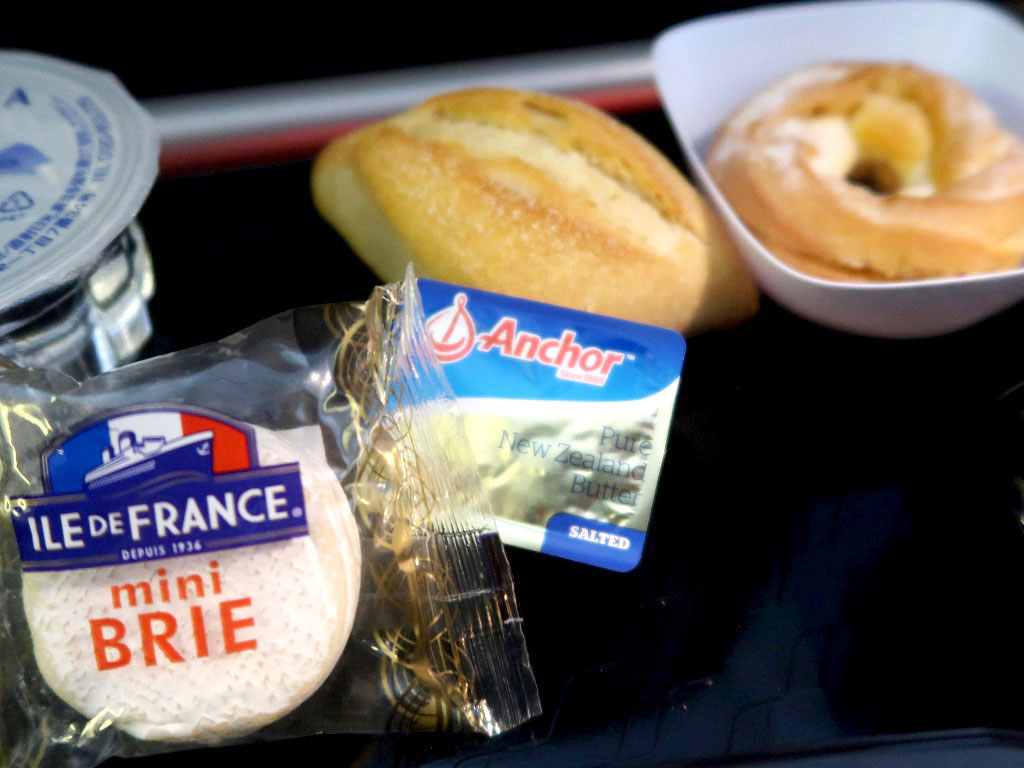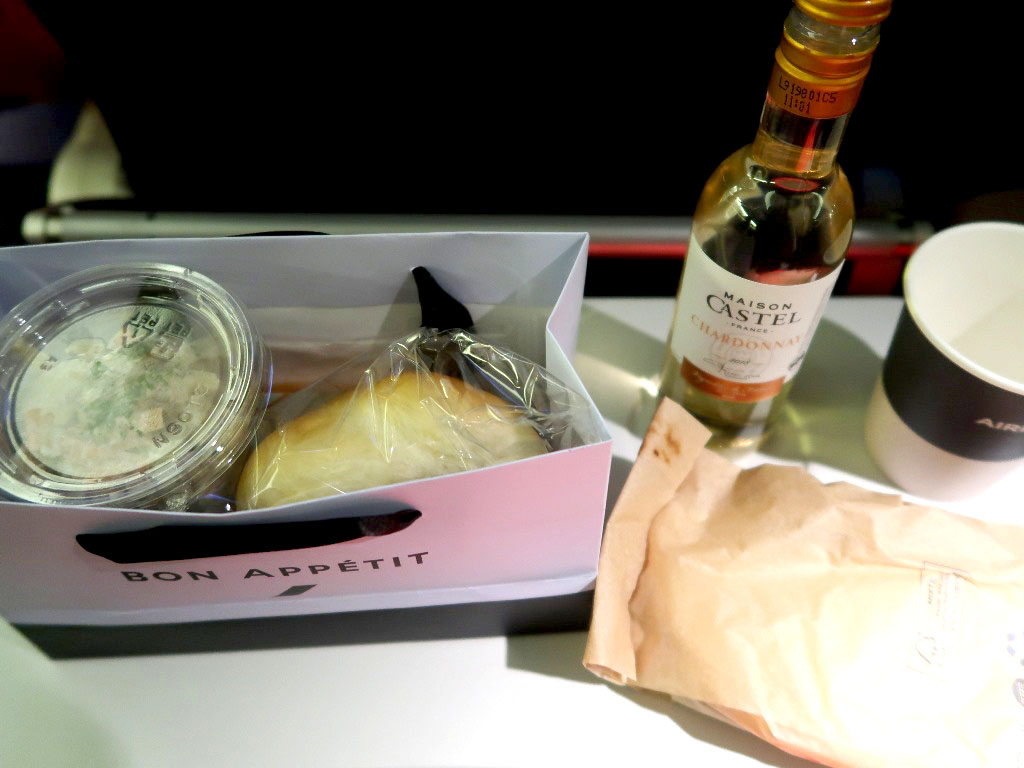 この便では、食事の前にアペリティフのドリンクとスナックが配られるはずなのですが、それがなく、いきなり食事が配られました。