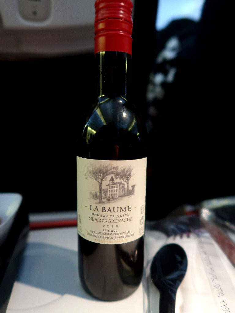 赤ワインは、エールフランス定番の「LA BAUME」というラングドック地方の銘柄。この赤ワインはメルロ種とグルナッシュ種のブレンドで、ヴィンテージは2018年でした。