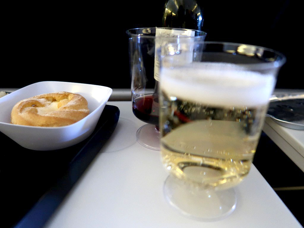 それではと、フランス人CAのお兄さんに「シャンパーニュと赤ワインの両方くださいね」とお願いしたのですが、ワゴンのシャンパーニュボトルは空。「あとで持ってきます」とCAさん。