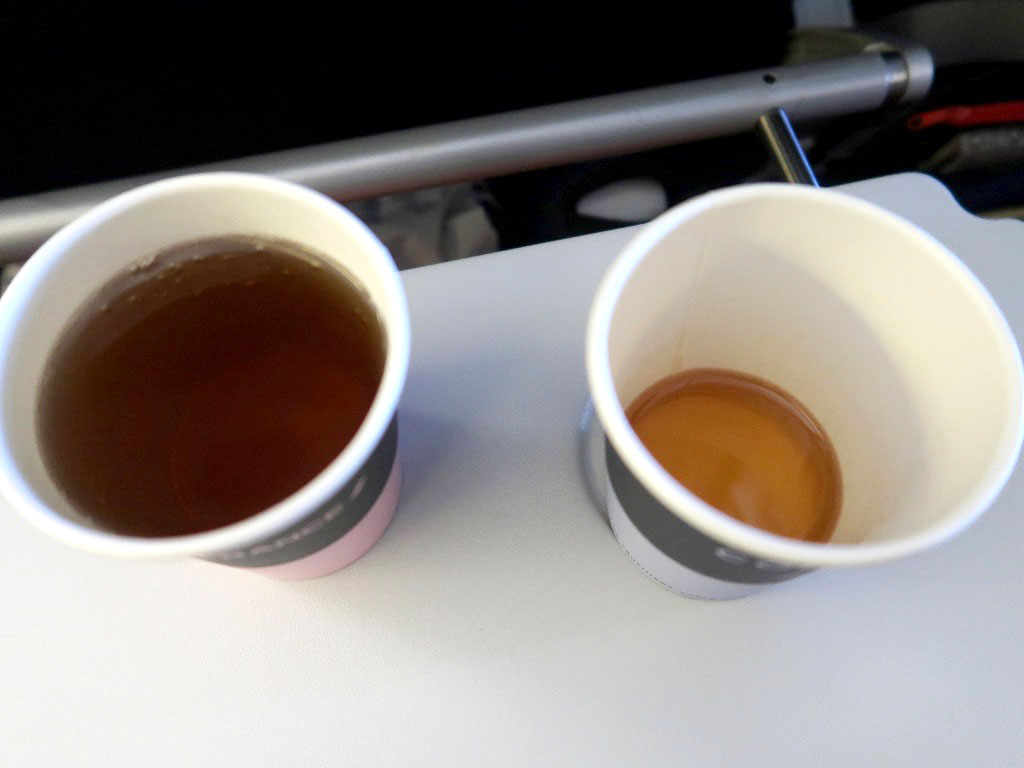 リキュールは50mlほどの小さなボトル入りですが、CAさんが開けてカップに入れてくれます。以前は透明プラカップでしたが、エールフランスはプラカップを廃止して紙カップになったので、右のカップは紅茶の飲み残しのように見えますね(笑)。