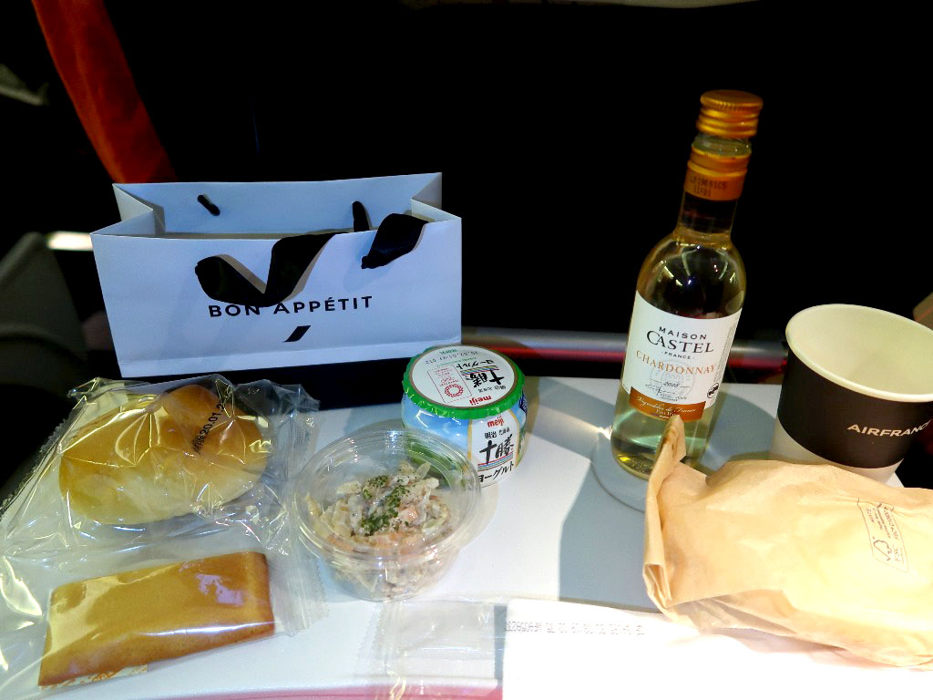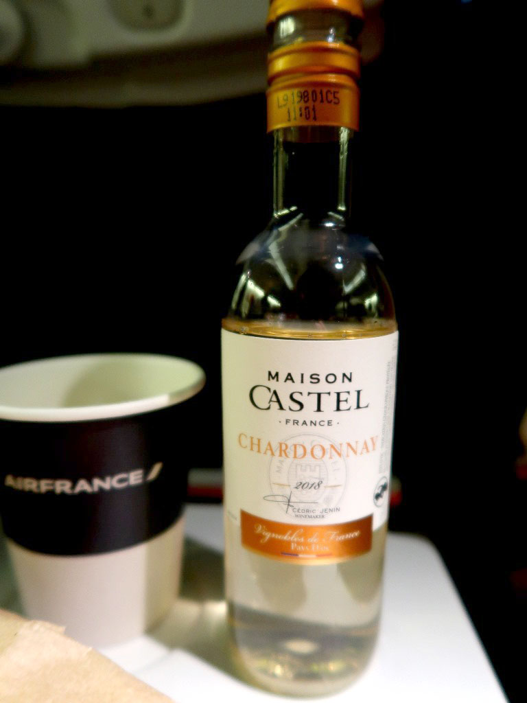 エールフランスのワインサービスは、187mlのミニサイズながらも、ちゃんとひとりに1本ずつボトルで渡してくれるのがうれしい。