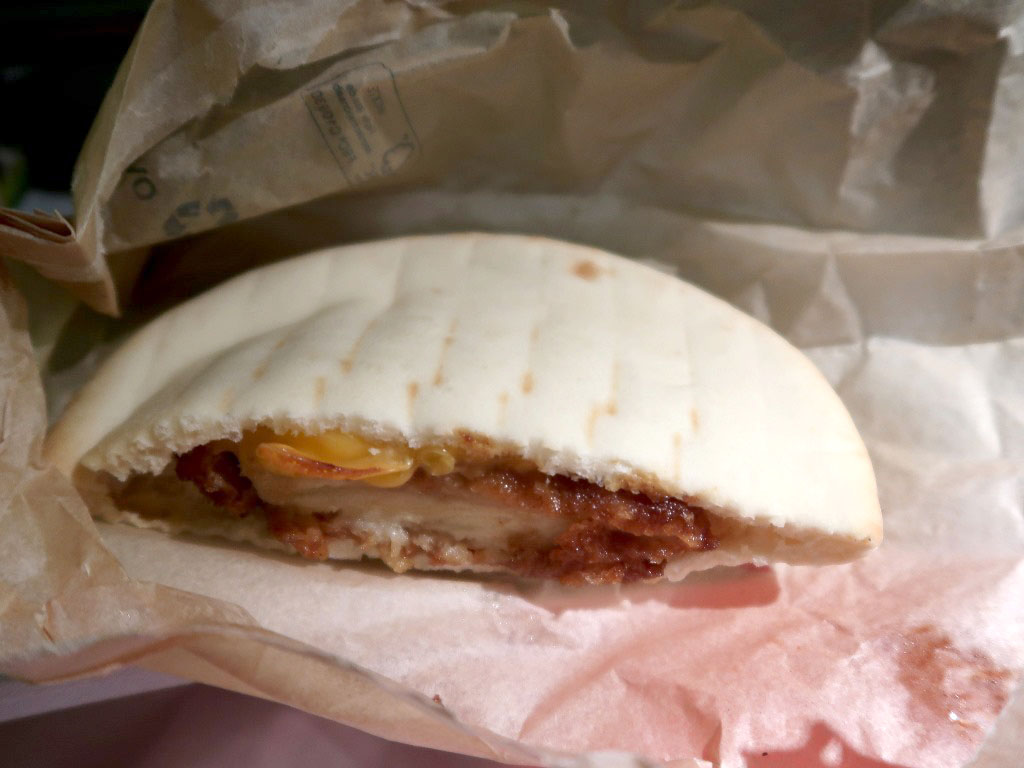 甘辛い鶏肉とチーズを挟んだピタサンドは、中の具も外のパンも温かく、味もいいものでした。食べやすいし、これはオススメ!