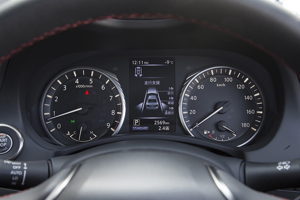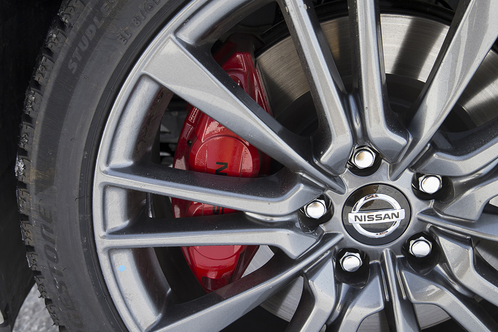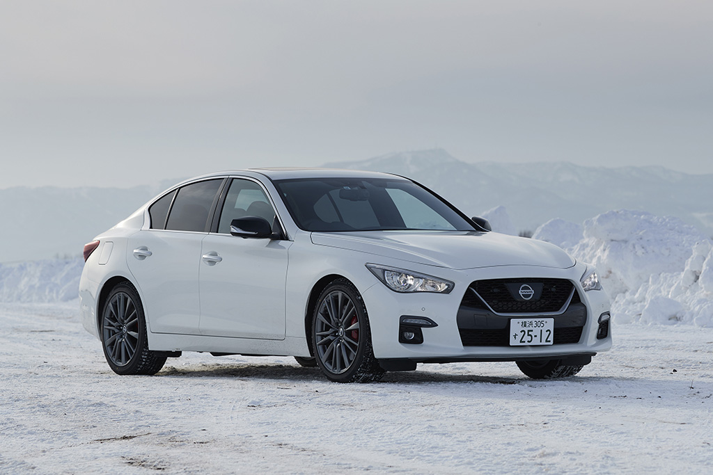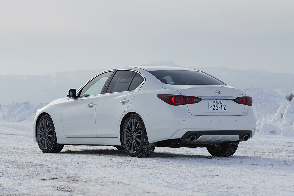現行スカイラインには“DAS(ダイレクトアダプティブステアリング)”と名づけられた“ステアバイワイヤ”機構が搭載されている。コレは、ハンドルとタイヤが機械的につながっておらず、ドライバーのハンドル操作を電気信号に置き換え、それを瞬時にモーターへと伝えてタイヤの向きを変える仕組みだ。そのため、タイヤを介して伝わってくるはずの路面からの振動がハンドルまでは伝わって来ず、雪道とは思えないほど滑らかなステアフィールを実現している。