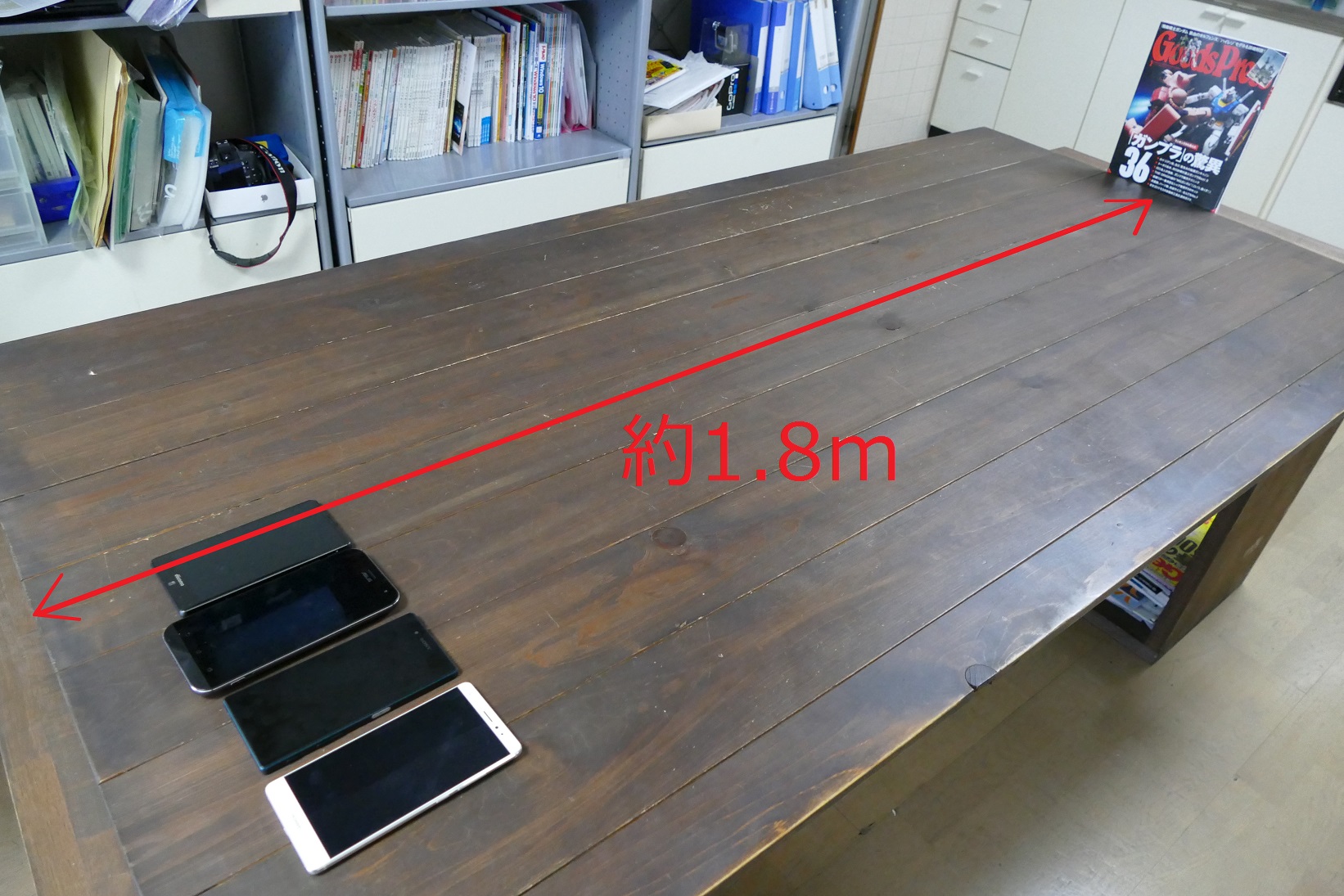会議用デスク(約1.8m)の端に被写体を設置し、反対側の端からスマホで動画撮影を行ないました。
