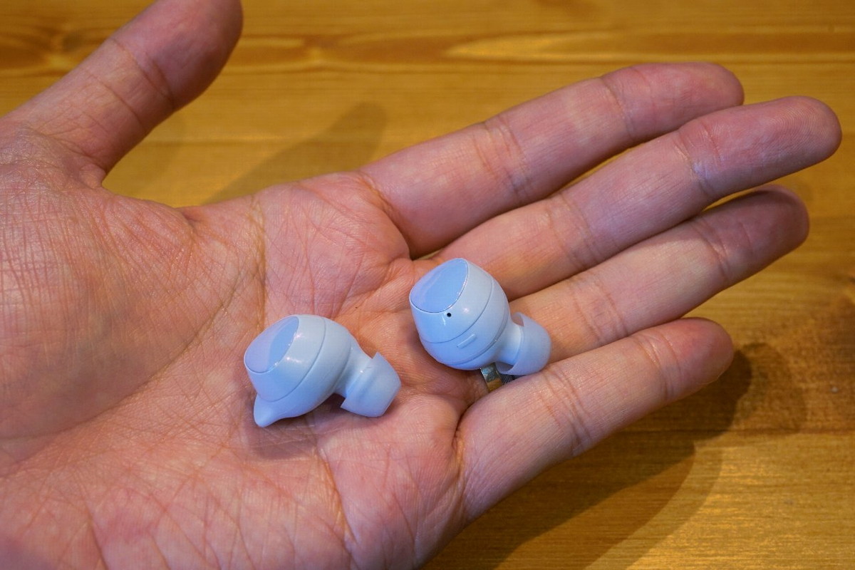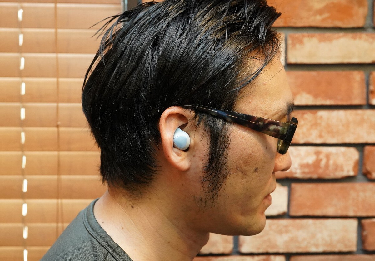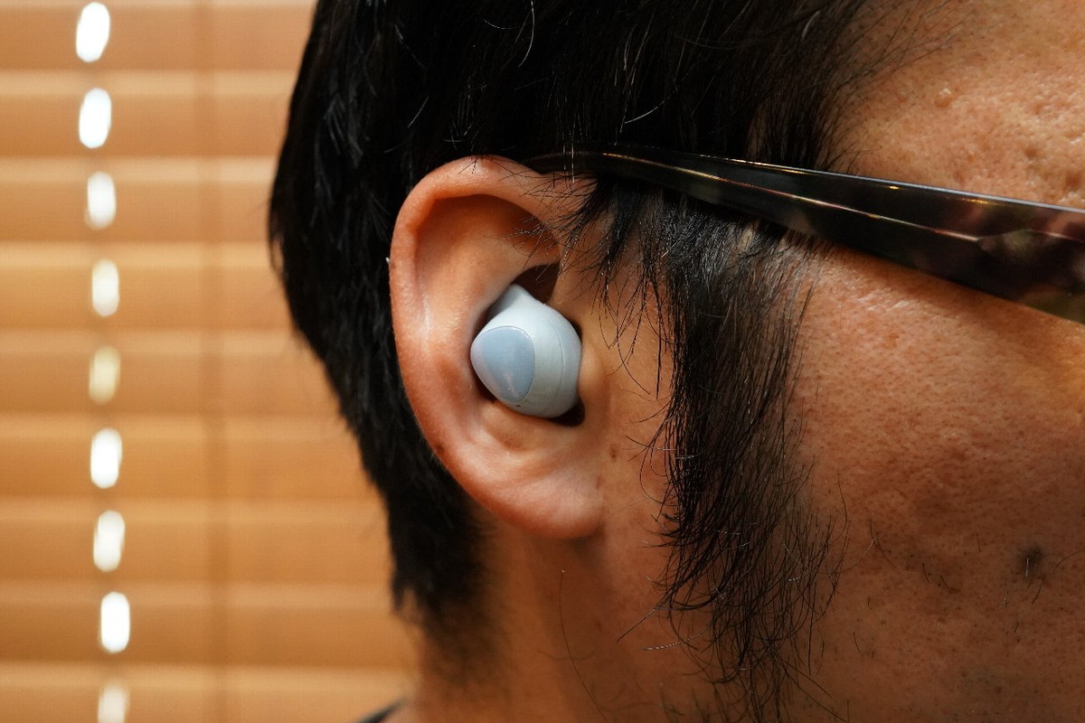完全ワイヤレスイヤホンでも当然人の目は気になるわけですが、前から見ても耳からの出っ張り具合が小さい。ちなみに重量は実測6.3gと中程度です。