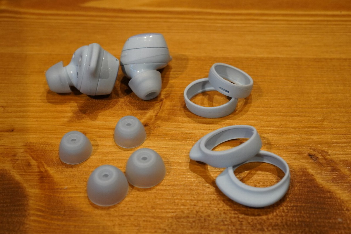 小型イヤホンはフィット感が心配になりますが、イヤーピースは3サイズ付属。ウイングチップ付きなので、耳の内側にしっかり固定も可能です。ただし、公式には防水性能を謳っていないのでスポーツ用として使う場合はご注意を。