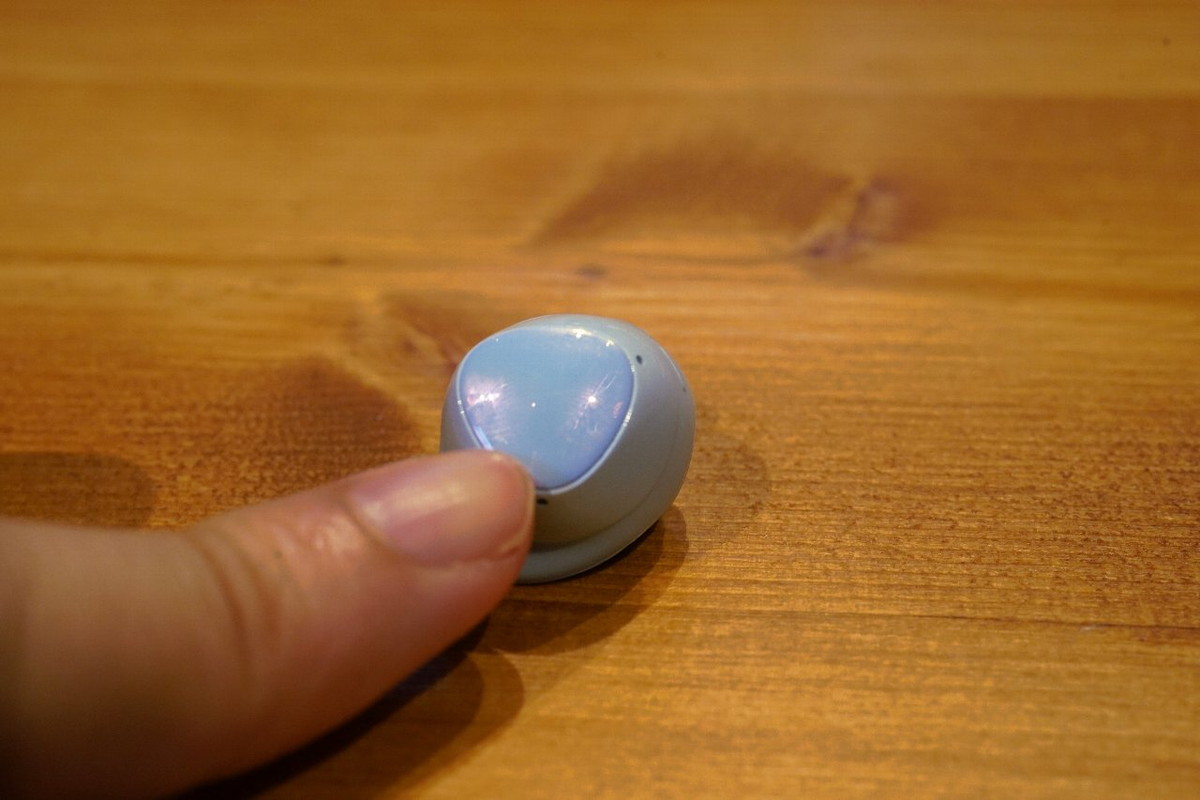 操作はタッチ式で、左右どちらも1回タップで再生/停止、2回タップで曲送り/曲戻し。音量操作はデフォルトでは割り当てられていませんが、アプリを使えばタッチパッド長押しに設定可能です。