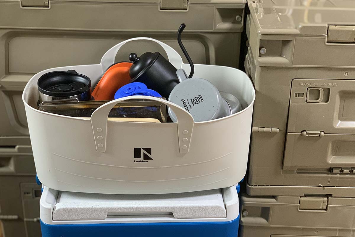 アウトドアギアを自宅では収納用に、キャンプの際はそのまま持ち出すといった使い方も可能です。とはいえさほど重いものは入れられないので(入れても10kg以内)、クッカーやナイフ、まな板などの調理道具入れとしての使用がちょうどいいかもしれません。