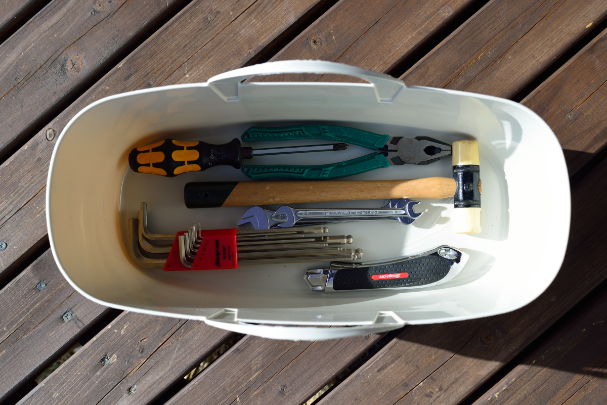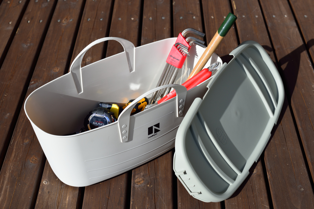 普段は工具ボックスに入れているツール類を入れたら意外と使い勝手が良好。ハンドルが付いているため手軽に持ち運べるし、開口部が広いから道具を探しやすいのもメリットです。