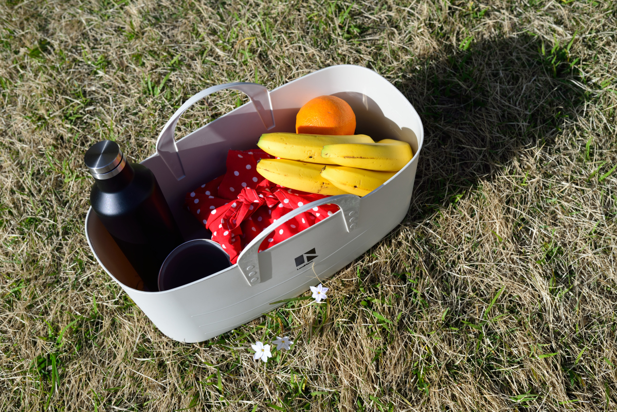 極めて普通の使い方ですが、ピクニックの際のバスケットとしては当たり前に使用可能。汚れても気にならないので、地面の上にそのまま置けます。