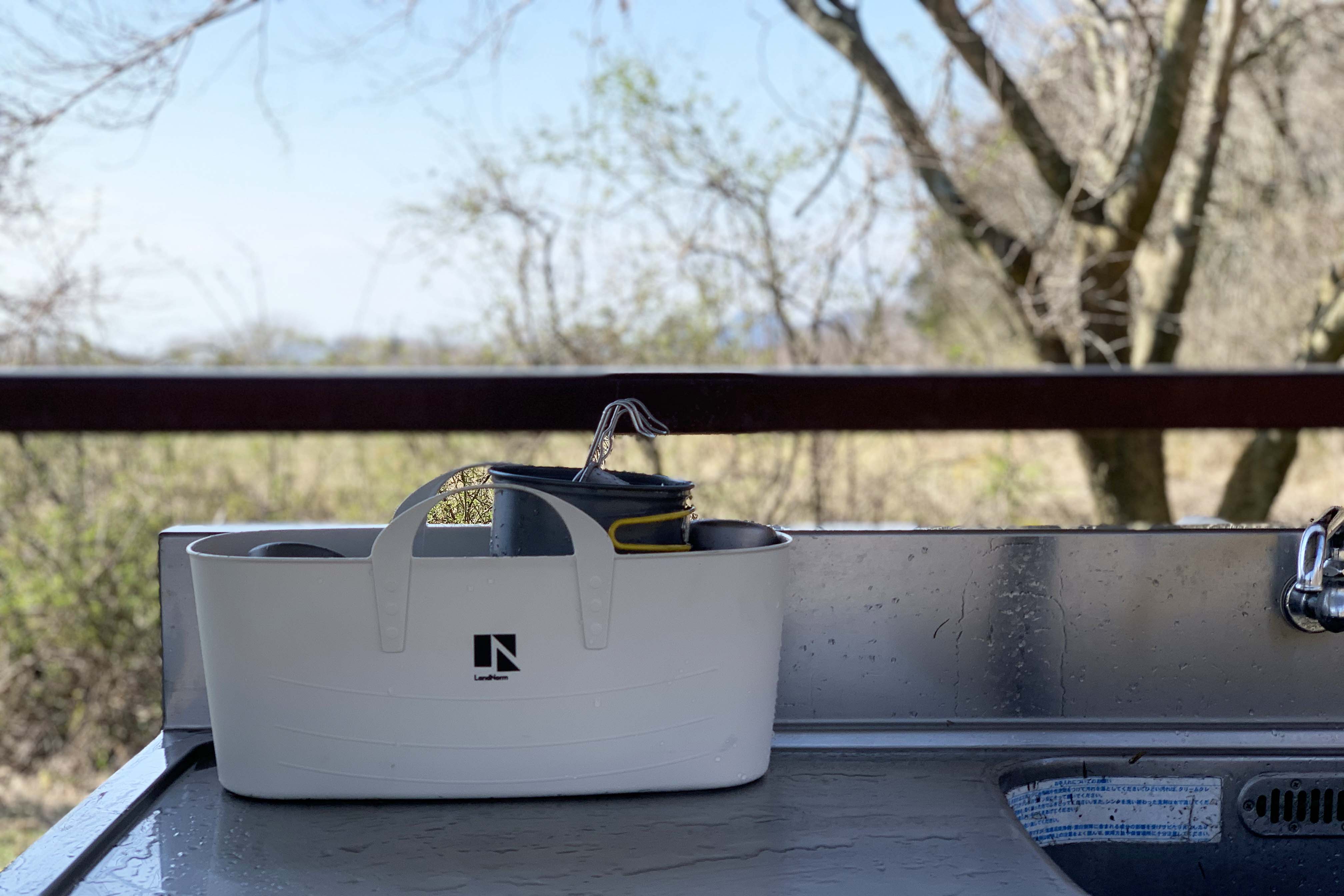 料理を食べ終わった後のお皿やキッチンウェアをバスケットに放り込めばそのまま持っていけるし、洗った後にテントサイトに持ち帰るのも楽。バスケットの中が食べ残しなどで汚れても簡単に落ちるので、メンテナンスも問題なし!