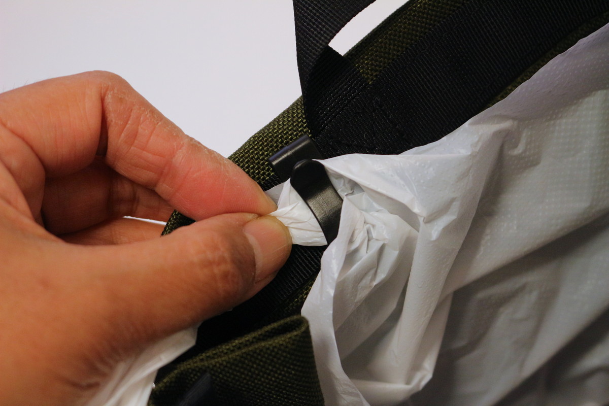 内側には4カ所、クリップが付いていてレジ袋、ビニール袋を取り付けられます。クリップは左右にスライドするので、袋の大きさによって微調整できるのもポイントです。