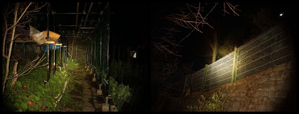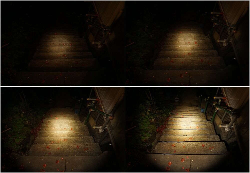 ジェネラルモードの4段階調光の様子です。足元、手元を照らすには充分な明るさがあり、普段使いであれば使えるモードが多いですね。日亜モデルはさほどルーメン重視のライトではありませんので、Medモードボディが熱くなり難く連続点灯も容易に行えます。