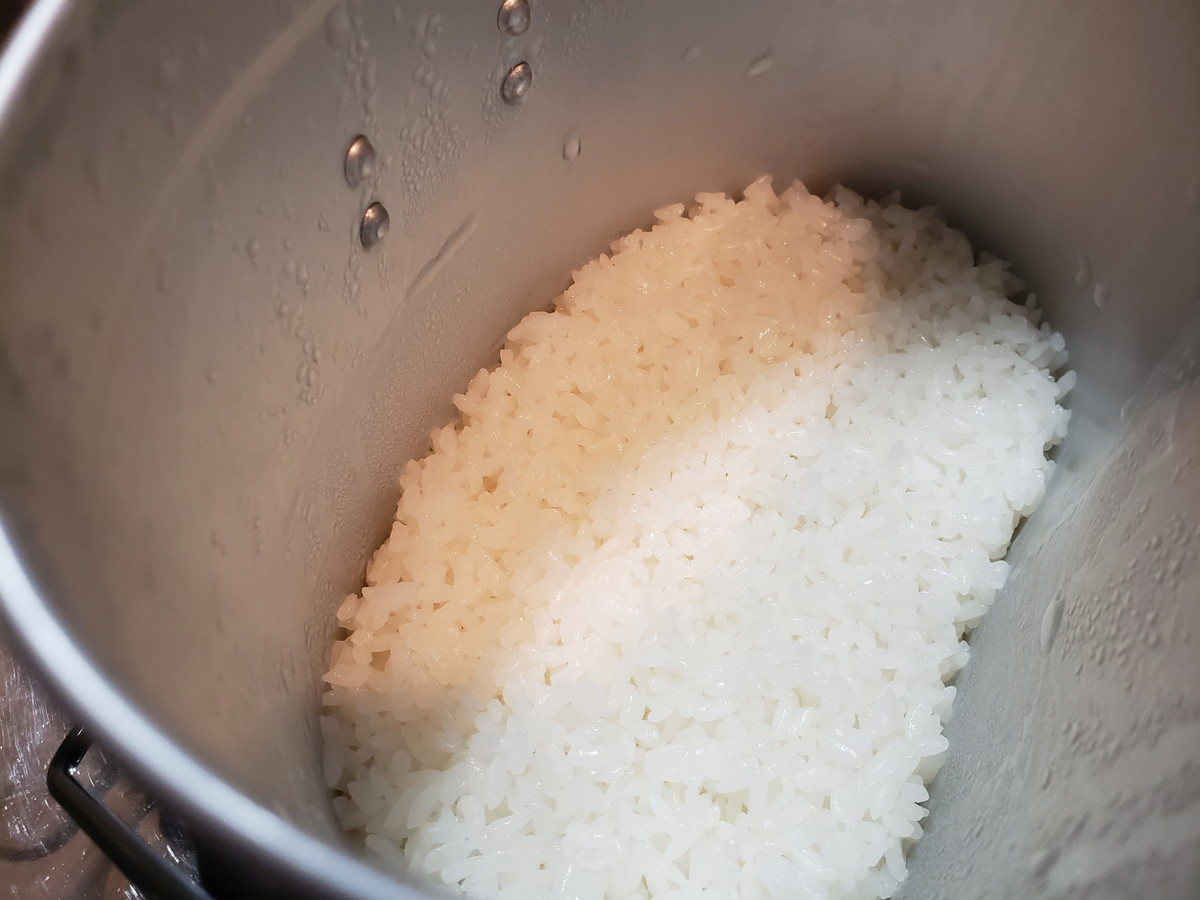 ここからは蒸らしです。ひっくり返して底を叩くというセオリーも実はやってもやらなくてもいいという話なので、コンロにのっけたままほったらかしで15分。