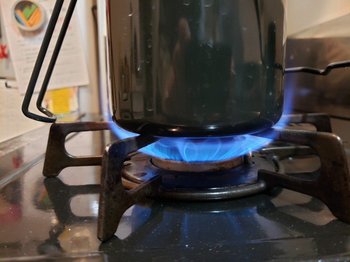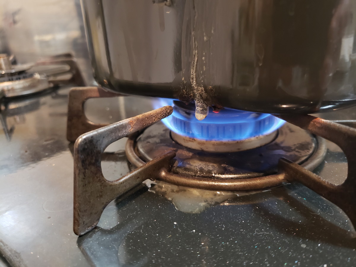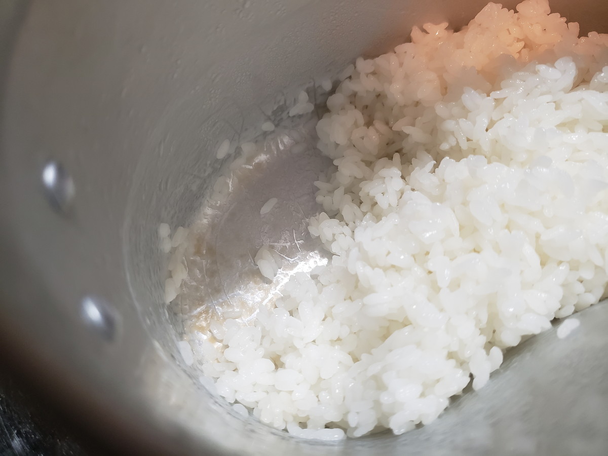 1合なので沸騰まではあっという間の約4分。フタの隙間から湯気がピューピュー出てきたのでフタを開けて中を確認。グツグツ煮立っていたので、火を弱めます。