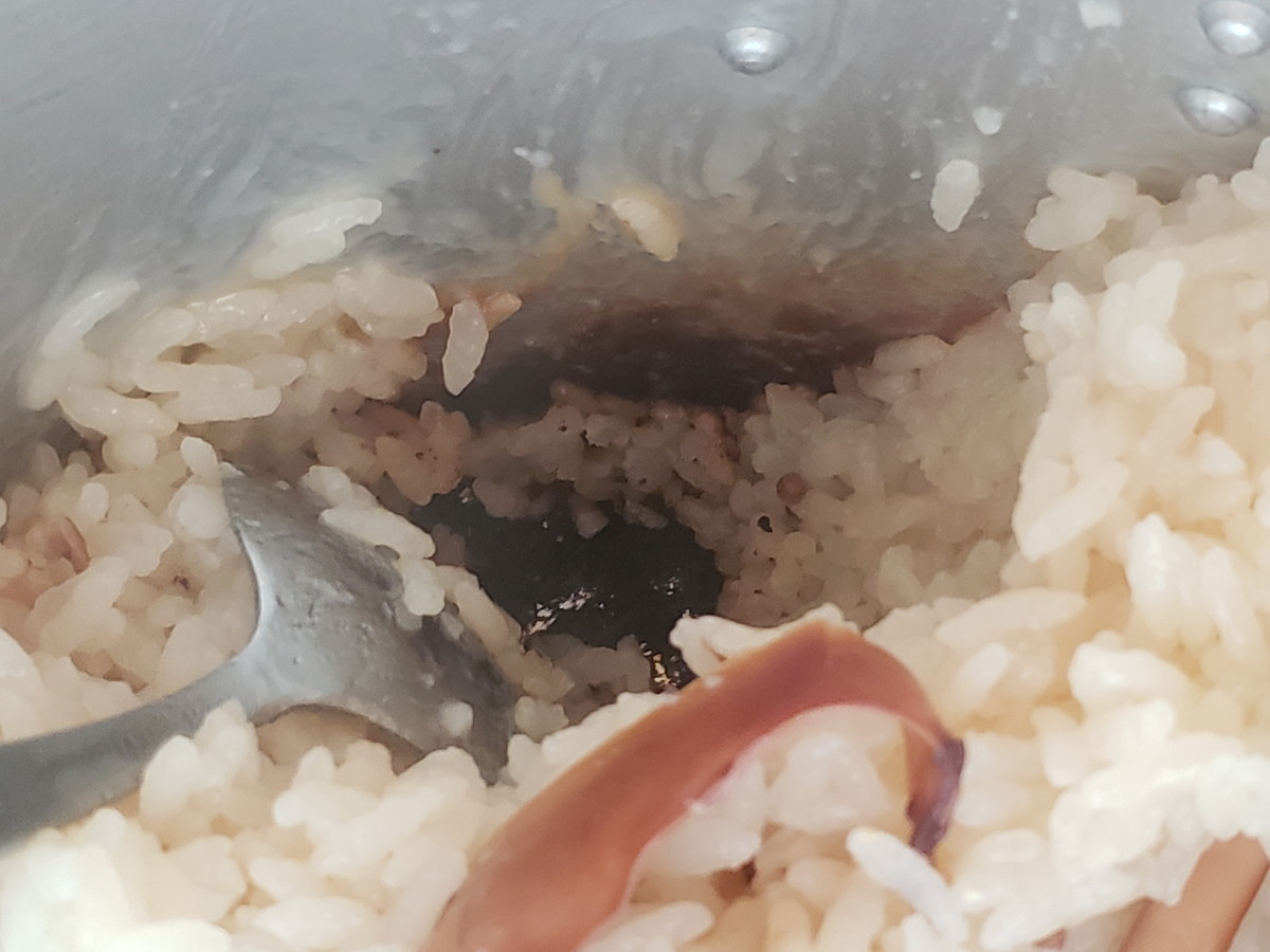底からグワッとご飯をひっくり返してみると、コゲはなし。おそらくですが、弱火にして乾いた音になってから、もう少しだけ火にかけ続けるとコゲができたのではないかと。こうやってコントロールできるというのも飯ごうならではかも。