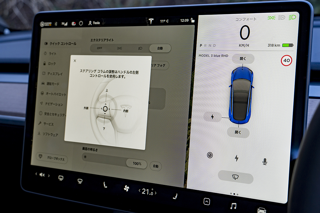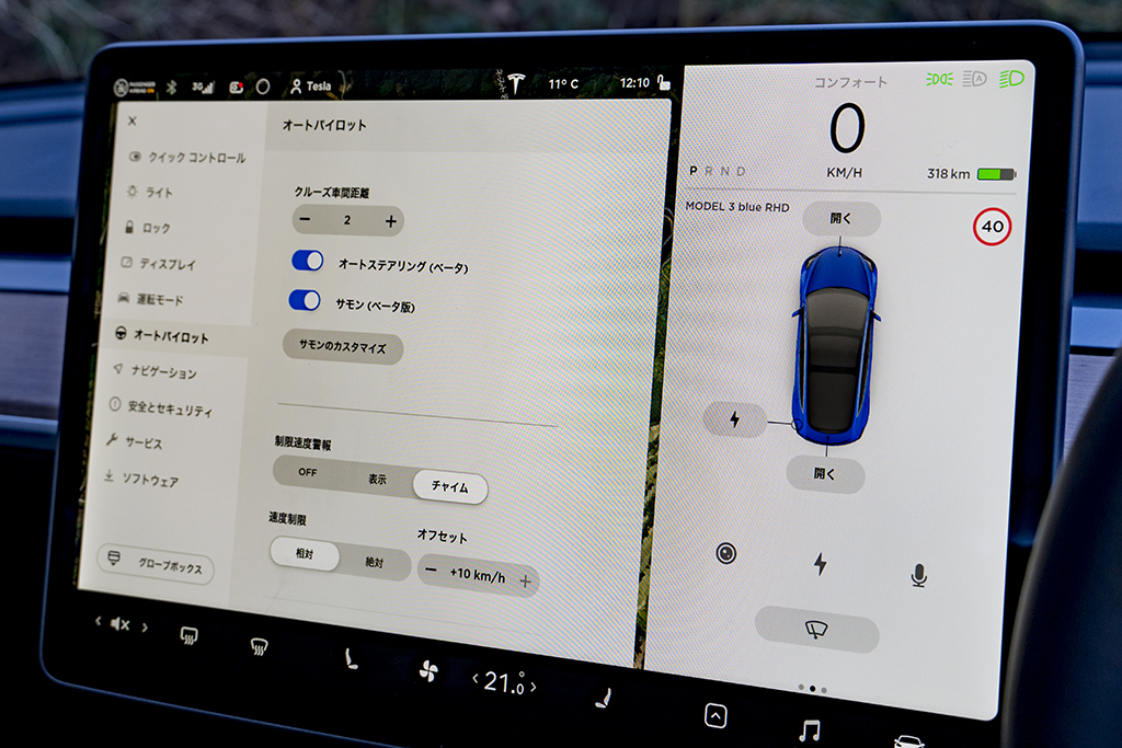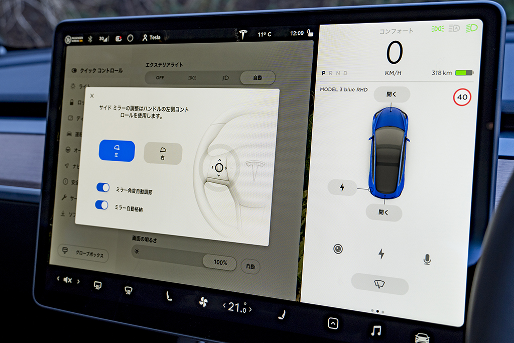 また、イマドキ欠かせない先進運転支援システムは、テスラらしさが最も色濃い部分で、160m離れた物体も捉える前方レーダー、車両周囲を見渡す12の超音波センサー、360度をカバーするカメラなどを搭載。その上、衝突警告や緊急ブレーキ、同一車線内での運転支援などを行う“オートパイロット”なども標準装備されます。ちなみにモデル3は、さらに高度な運転支援にも対応可能ですが、こちらは法整備の状況によりけり、というところ。とはいえ、通信を利用してシステムのアップデートで対応可能となる点は、テスラの真骨頂ともいえるでしょう。