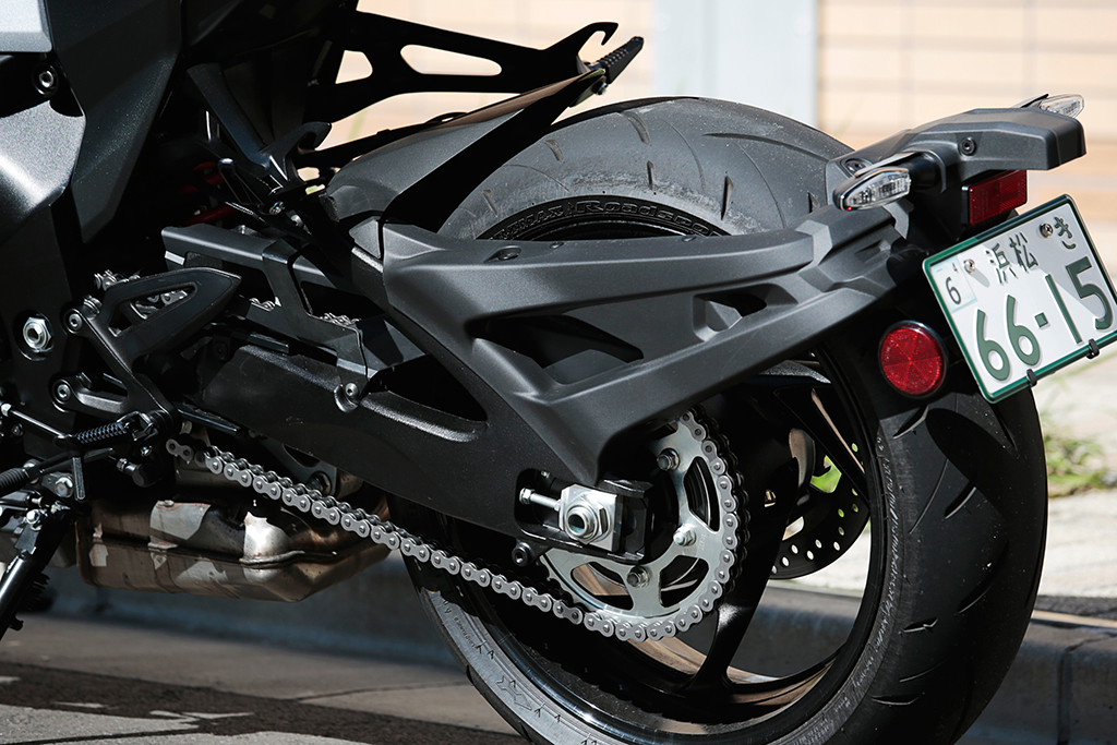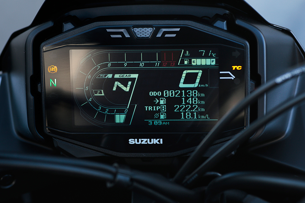 ライドフィールの第一印象はハードですが、一方で、スズキのトップ・オブ・スポーツバイク「GSX-R1000」由来のツインカム4バルブは、それこそクランクのひと回り目から豊かなトルクを提供してくれる“よく練れた”エンジンです。いい意味で“リッター”を感じさせない穏やかなマルチシリンダーで、街中でも使いやすい。