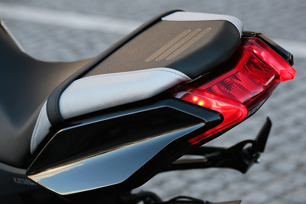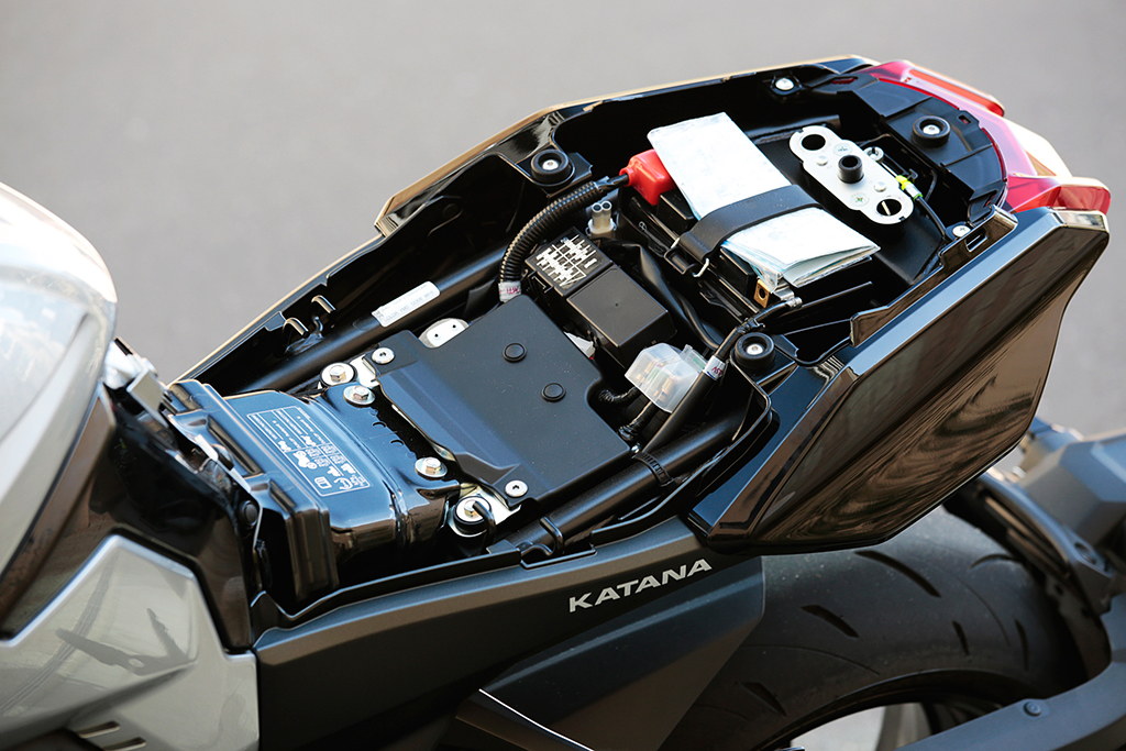 あえて新型KATANAにケチを付けるとすると、デザインコンシャスを徹底したためか、小物入れはおろか、ETC車載器の置き場にも困るほどスペースがないことと、ふたり乗りが実質的にムリ…とはいい過ぎとしても、非常に難しくなったことでしょうか。