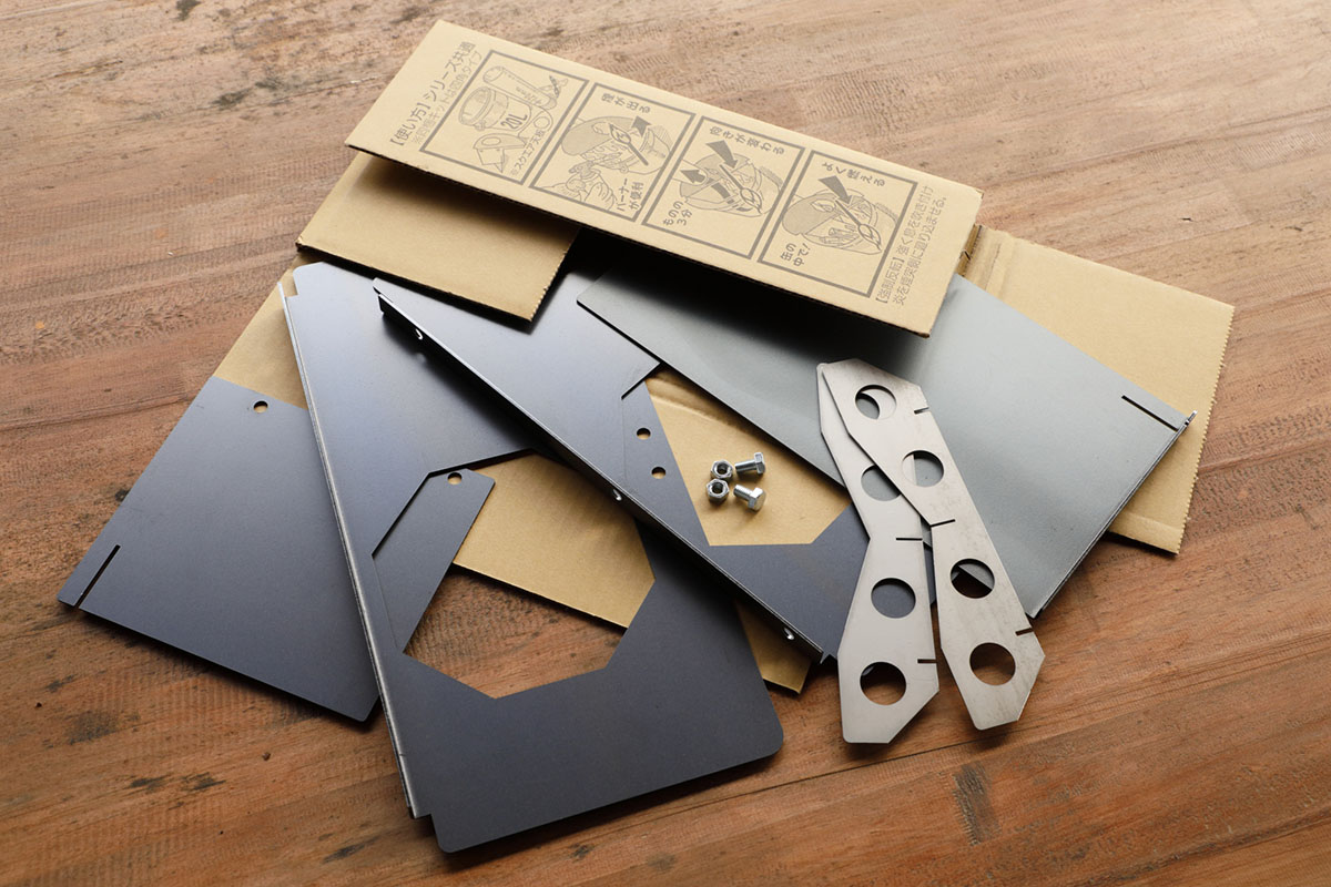 届いたのは思っていたよりはるかに薄い包み…。こんなもので本当に焚き火ができるのかと少し心配になりながらパッケージを開いてみると、数枚の金属パーツだけ。