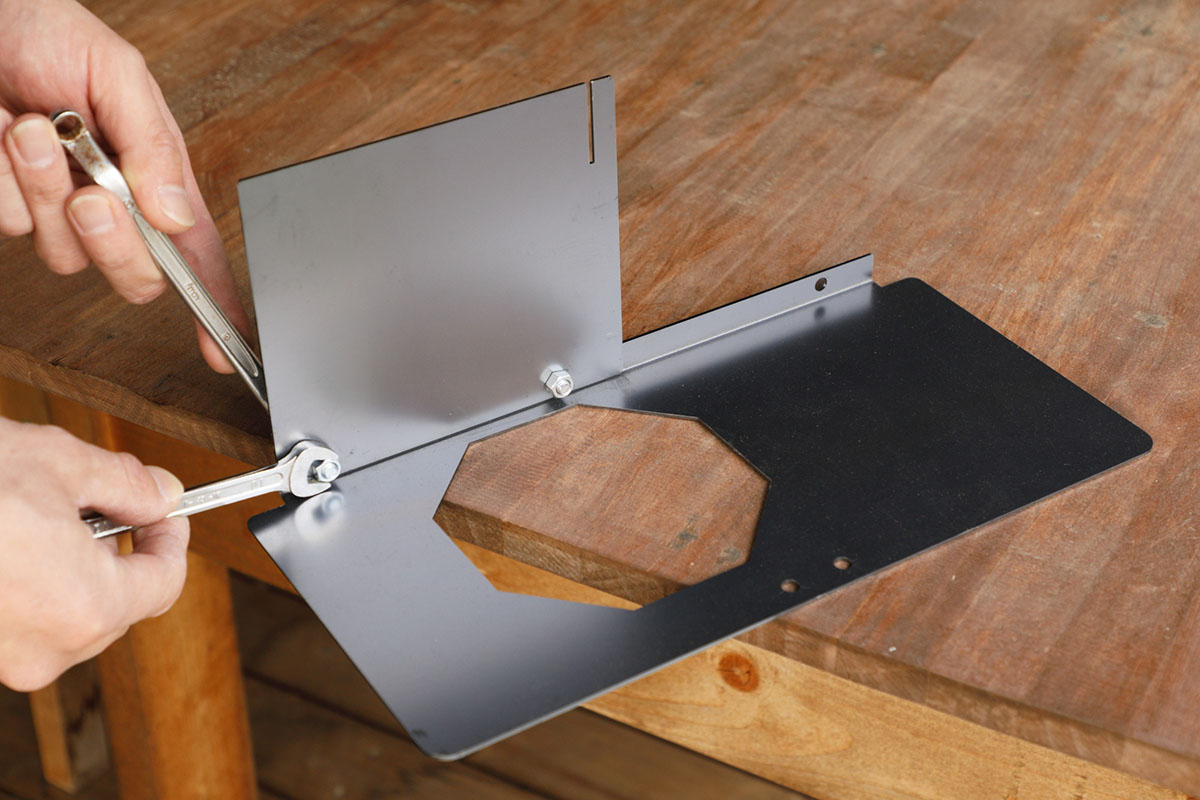早速、組み立て開始。とはいっても、組み立ての工程で唯一、工具を使うのは天板と仕切り板の結合部分だけ。2枚の金属プレートを、10mmのボルトとナットで結合すればメインフレームの完成です。